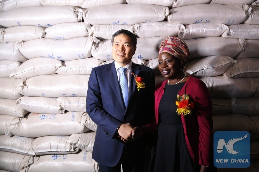 Chinese Vice Minister of Commerce Qian Keming (L) shakes hands with Zimbabwean Public Service, Labor and Social Welfare Minister Sekesai Nzenza during the rice handover ceremony in Harare, Zimbabwe, May 24, 2019.(Xinhua/Zhang Yuliang)