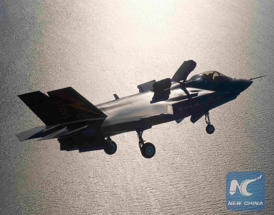 A F-35 fighter jet prepares for landing with its life fan cover deployed over Patuxent River Naval Air Station, Maryland in this undated handout image. (Xinhua/REUTERS)