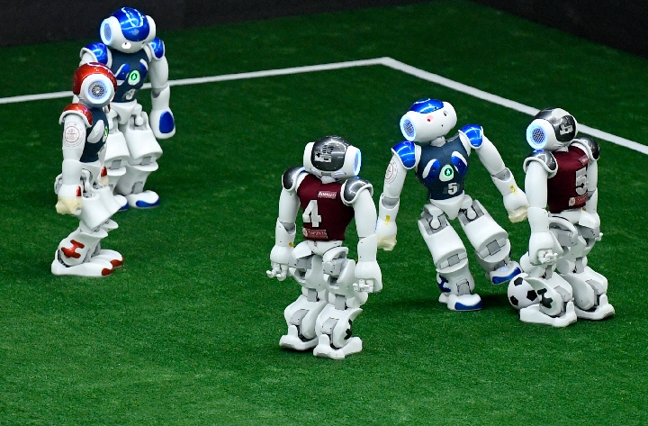 Robot soccer players take part in the 2019 RoboCup Asia-Pacific Invitational Tournament during the third World Intelligence Congress in Tianjin, north China, May 17, 2019. (Xinhua/Yue Yuewei)