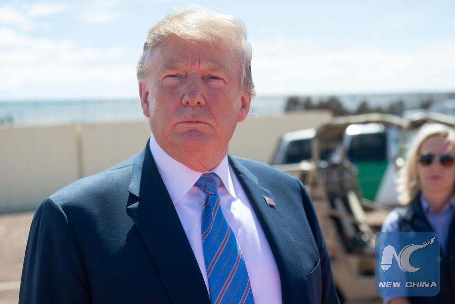 U.S. President Donald Trump speaks with members of the US Customs and Border Patrol as he tours the border wall between the United States and Mexico in Calexico, California on April 5, 2019. (Xinhua/AFP/Saul Loeb)