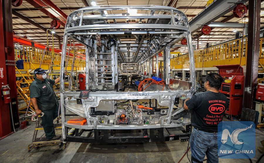 File photo of people work at a BYD electric vehicle plant in Lancaster, California, the United States, on Sept. 23, 2016.