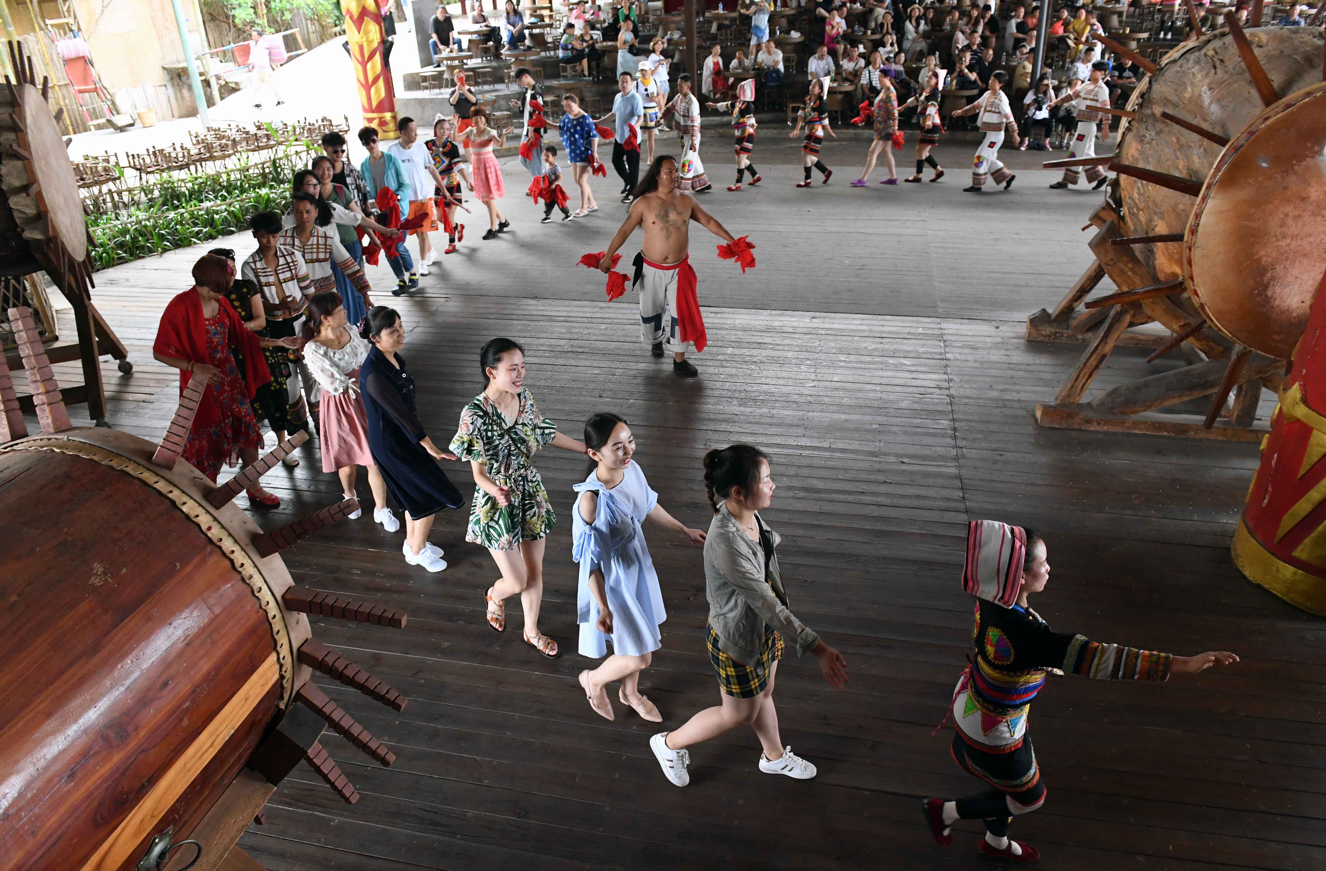 Photo taken on June 4, 2019 shows visitors and performers dancing together to the drum beat in Jino Village, southwest China's Yunnan Province. (Xinhua/Yang Zongyou)