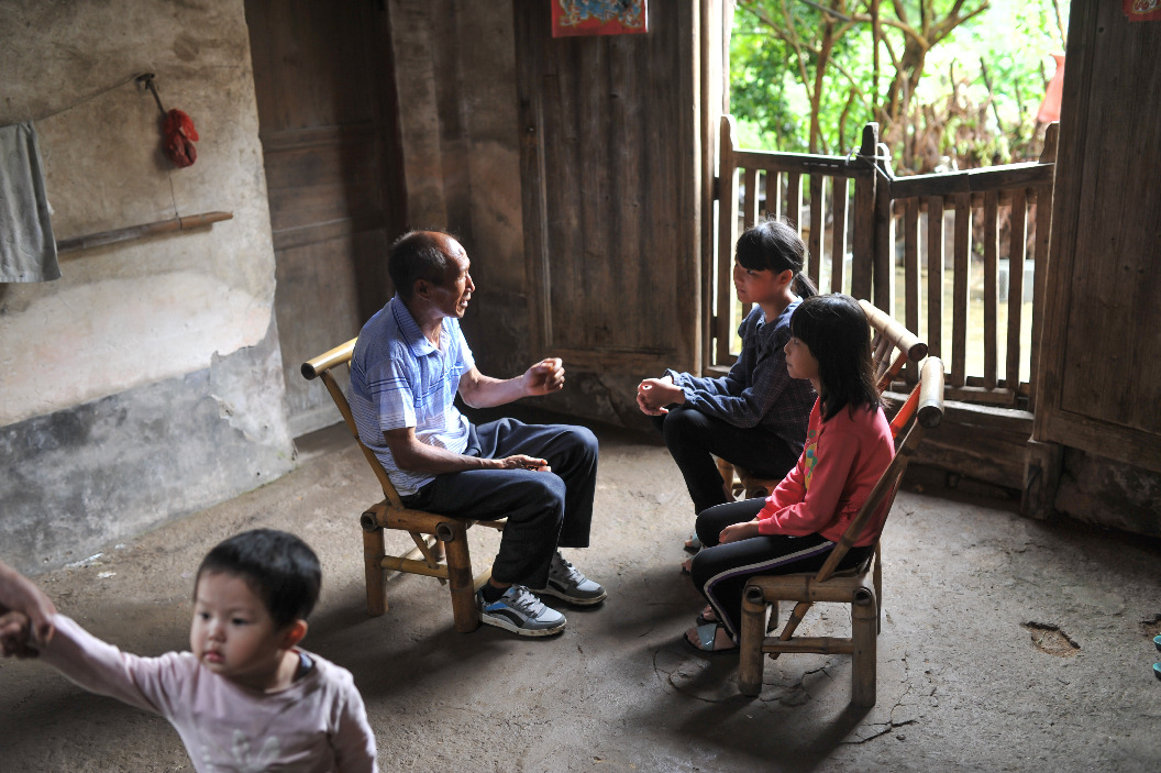 Villager Xie Nanjing tells story of martyr Deng Yigang to his granddaughters at home in Shihan Village, Kuantian Town, Yudu County, east China's Jiangxi Province, June 13, 2019. (Xinhua/Li Renzi)