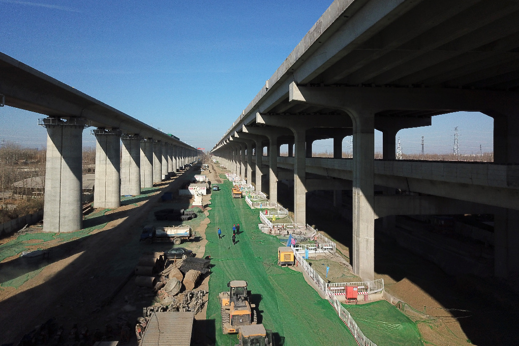 Photo taken on Dec. 29 shows that the Beijing Daxing International Airport highway and railway is under construction. (Xinhua/Ju Huanzong)