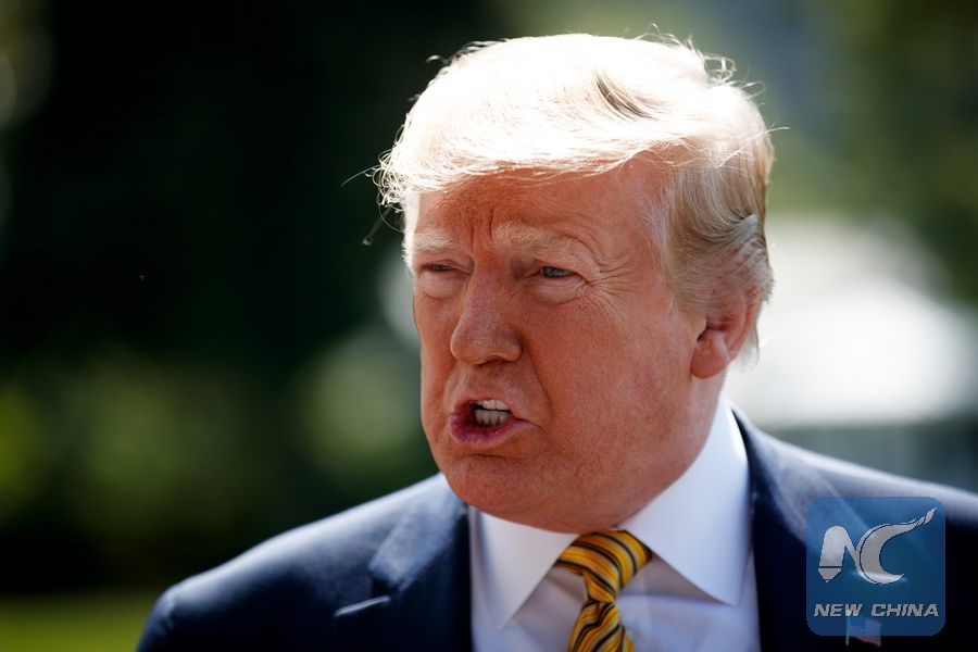 U.S. President Donald Trump speaks to reporters before departing from the White House in Washington D.C., the United States, June 22, 2019. Donald Trump on Saturday said that the United States would impose major additional sanctions against Iran on Monday. (Xinhua/Ting Shen)