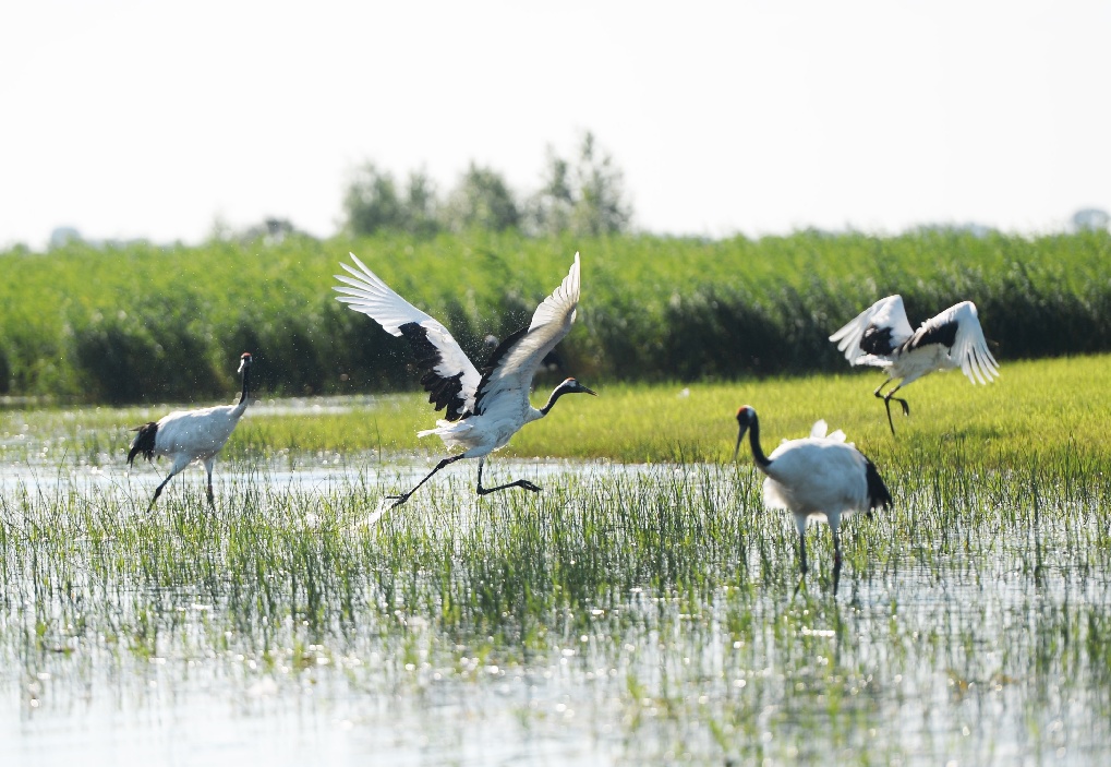 Red-crowned cranes are seen at Zhalong National Nature Reserve in Qiqihar, northeast China's Heilongjiang Province, Aug. 1, 2018. (Xinhua/Meng Chenguang)