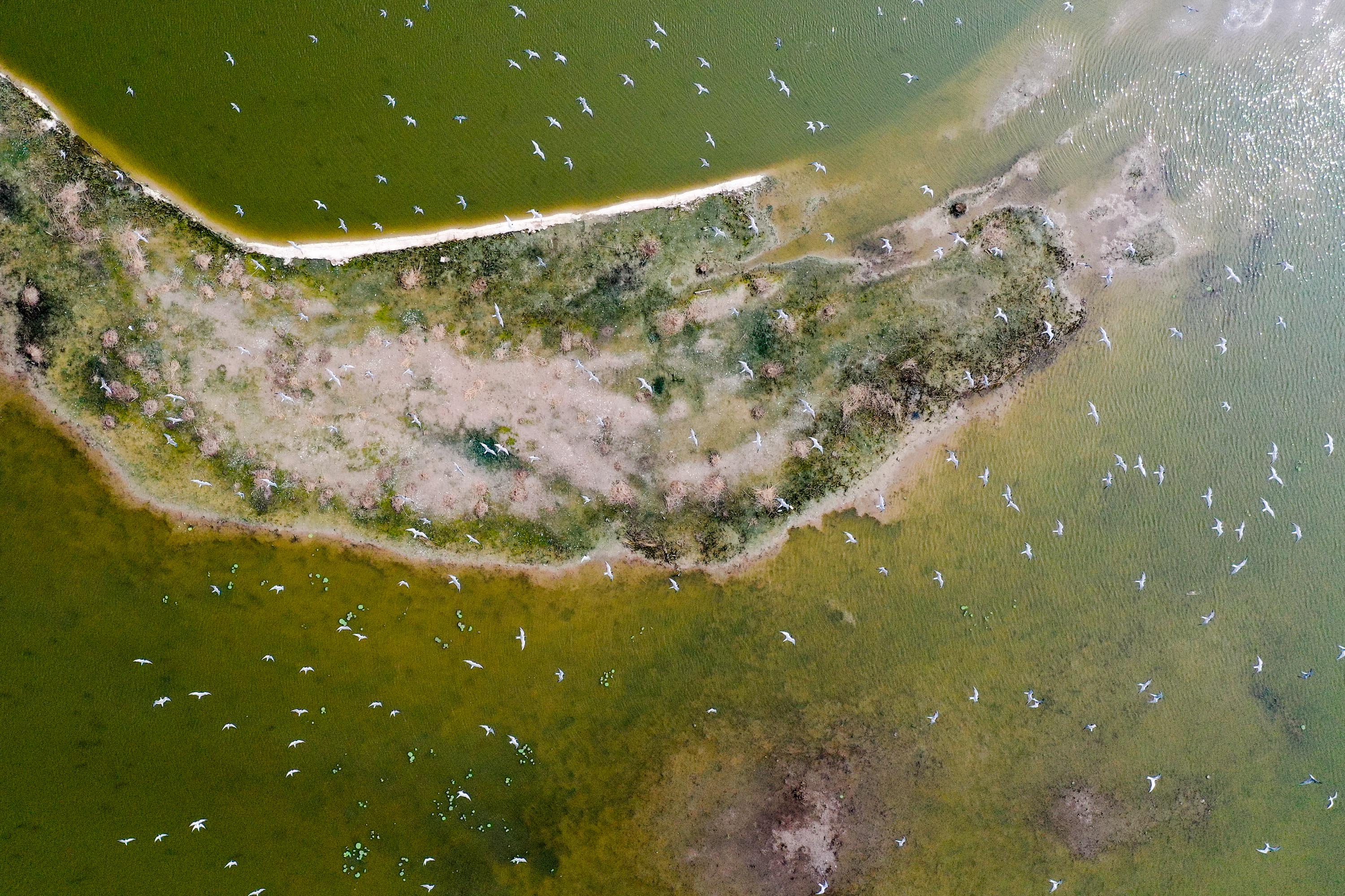 Terns fly over the Dafeng Milu National Nature Reserve in Yancheng. (Xinhua/Li Bo)