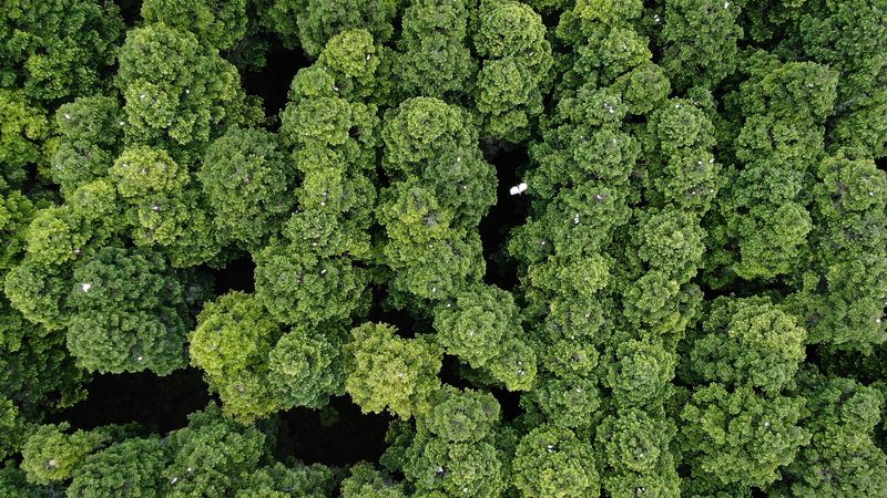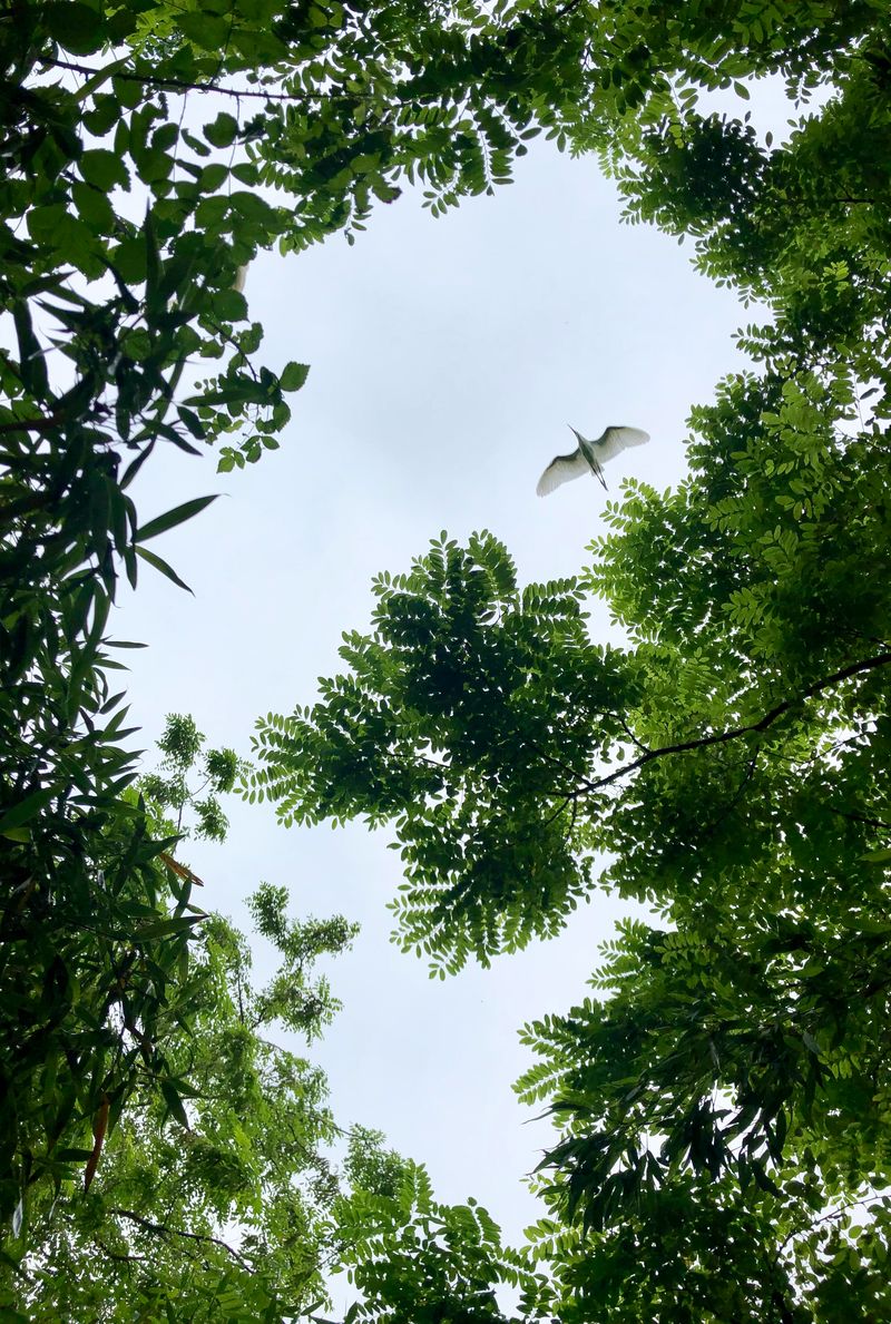 An egret flies over trees at the Dafeng Milu National Nature Reserve in Yancheng. (Xinhua/Li Xiang)