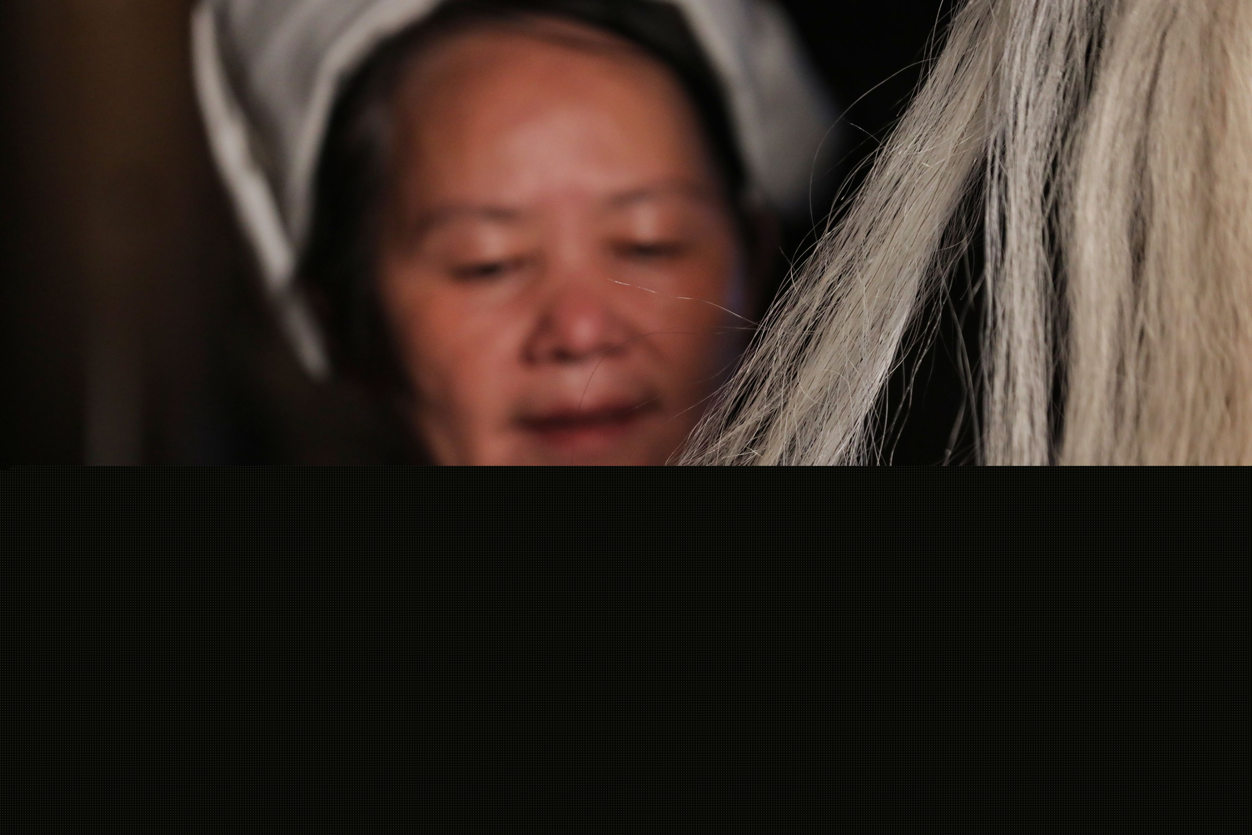 Wei Taohua picks horse tail fibers to make sewing threads for the traditional horse tail embroidery. (Xinhua/Ou Dongqu)