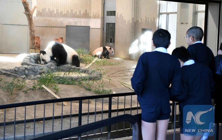 Students look at giant panda cub Xiang Xiang (R) and her mother Fairy (Japanese name Shin Shin) at Tokyo's Ueno Zoological Gardens, Japan, Dec. 18, 2017. (Xinhua/Ma Ping)