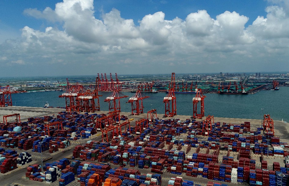 Aerial photo taken on July 10, 2019 shows the railway container freight dock at Jingtang port area of Tangshan Port, north China's Hebei Province. (Xinhua/Yang Shiyao)