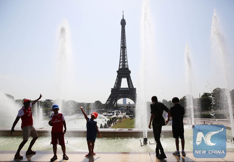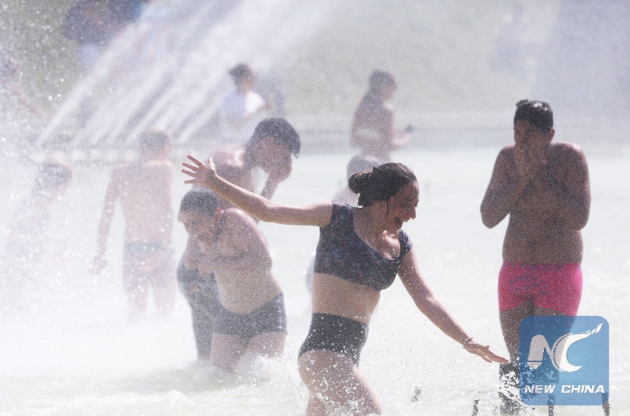 People cool themselves at a fountain near the Trocadero Place in Paris, France, July 25, 2019. (Xinhua/Gao Jing)