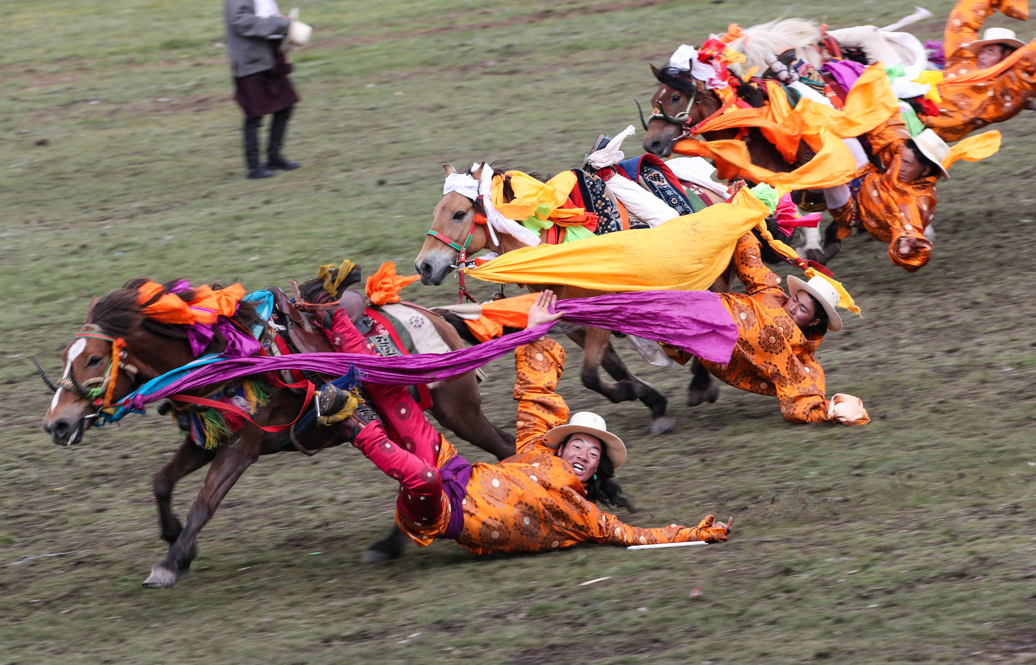 Riders perform horsemanship during a horse racing festival in Litang County, southwest China's Sichuan Province, July 30, 2019. (Xinhua/Jiang Hongjing)