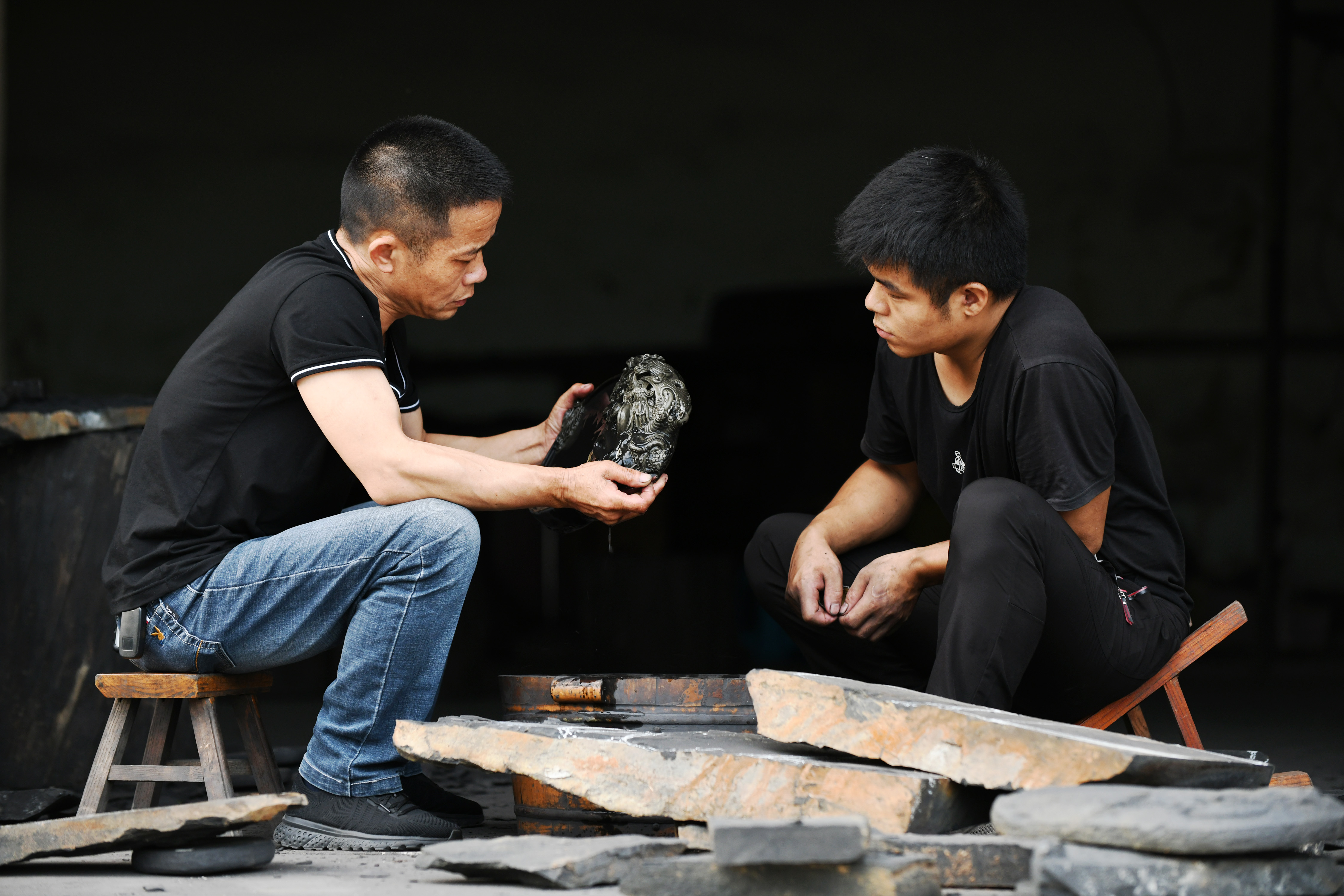 Zhou and his apprentice select stones to make the Sizhou inkstone in Cengong County, SW China's Guizhou Province, July 30, 2019. (Xinhua/Yang Wenbin)