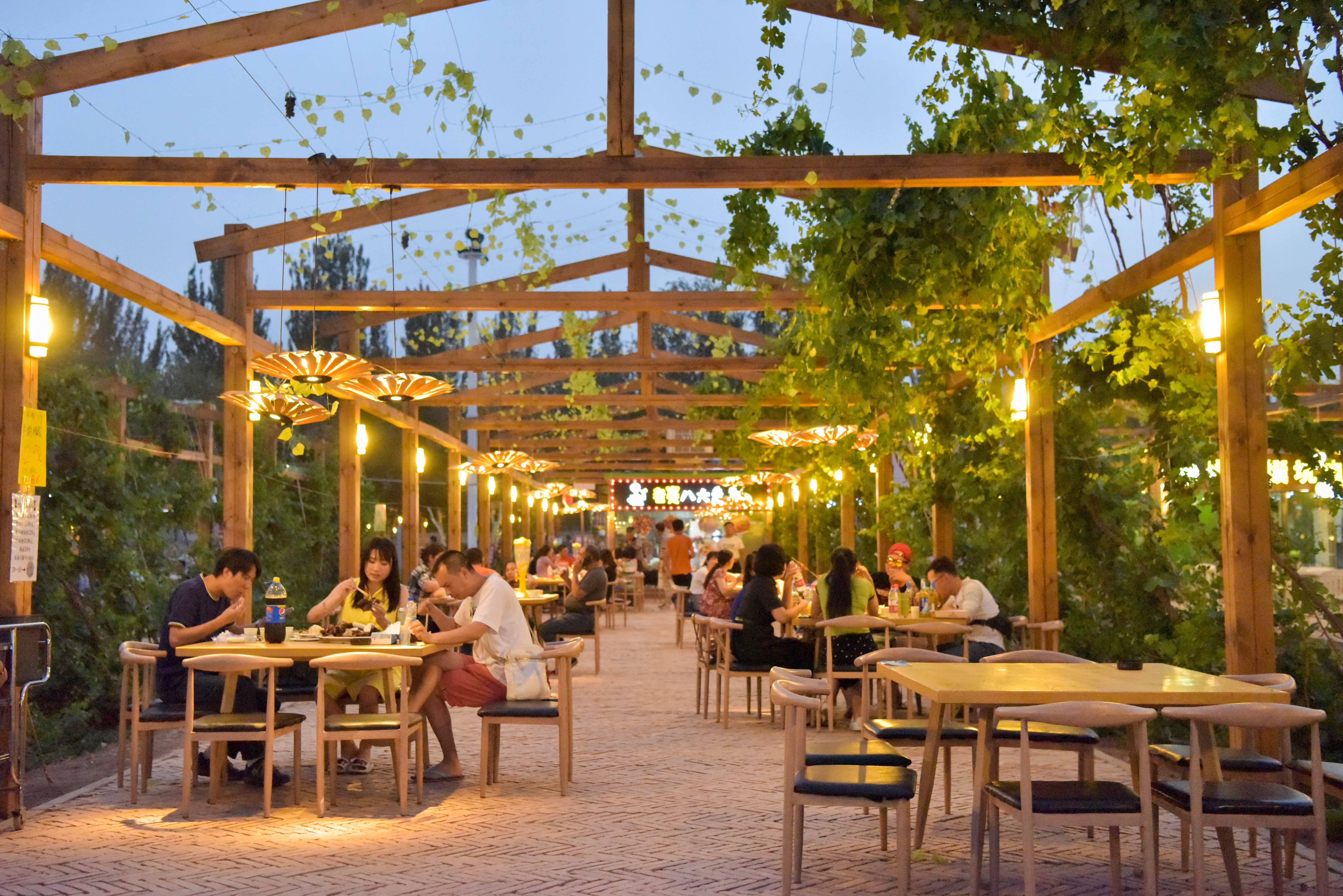 Citizens and tourists have their meals under grape trellis at a night fair held in Turpan, northwest China's Xinjiang Uygur Autonomous Region, July 18, 2019. Xinjiang has entered its peak season for tourism. The night fair, with a theme of grape, attracted a lot of citizens and visitors to spend their leisure time and enjoy the cool there. (Xinhua/Ding Lei)