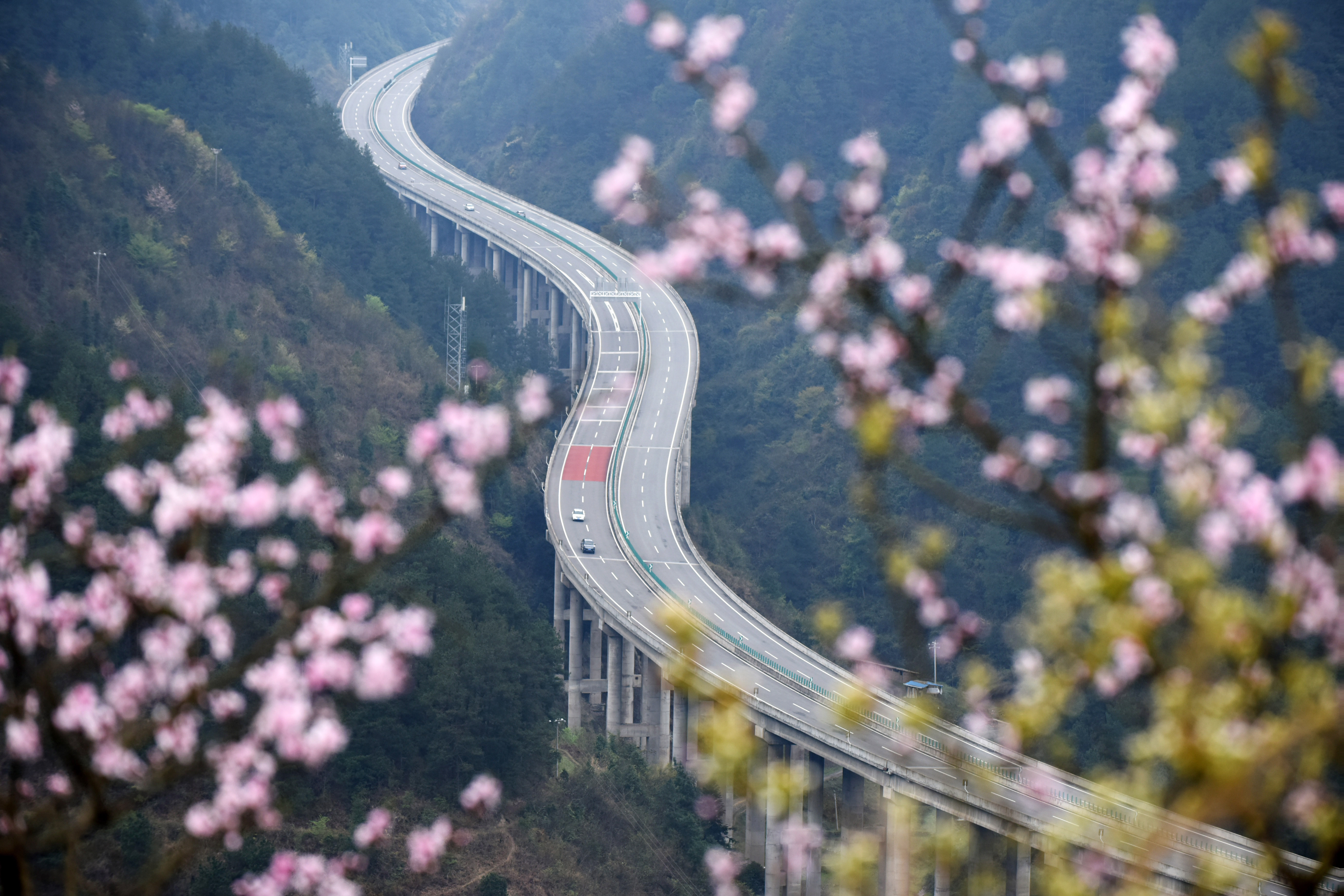 Flowers along the Sijian expressway linking Sinan with Jianhe at Censong Township of Jianhe County, southwest China's Guizhou Province. (Xinhua/Yang Wenbin)