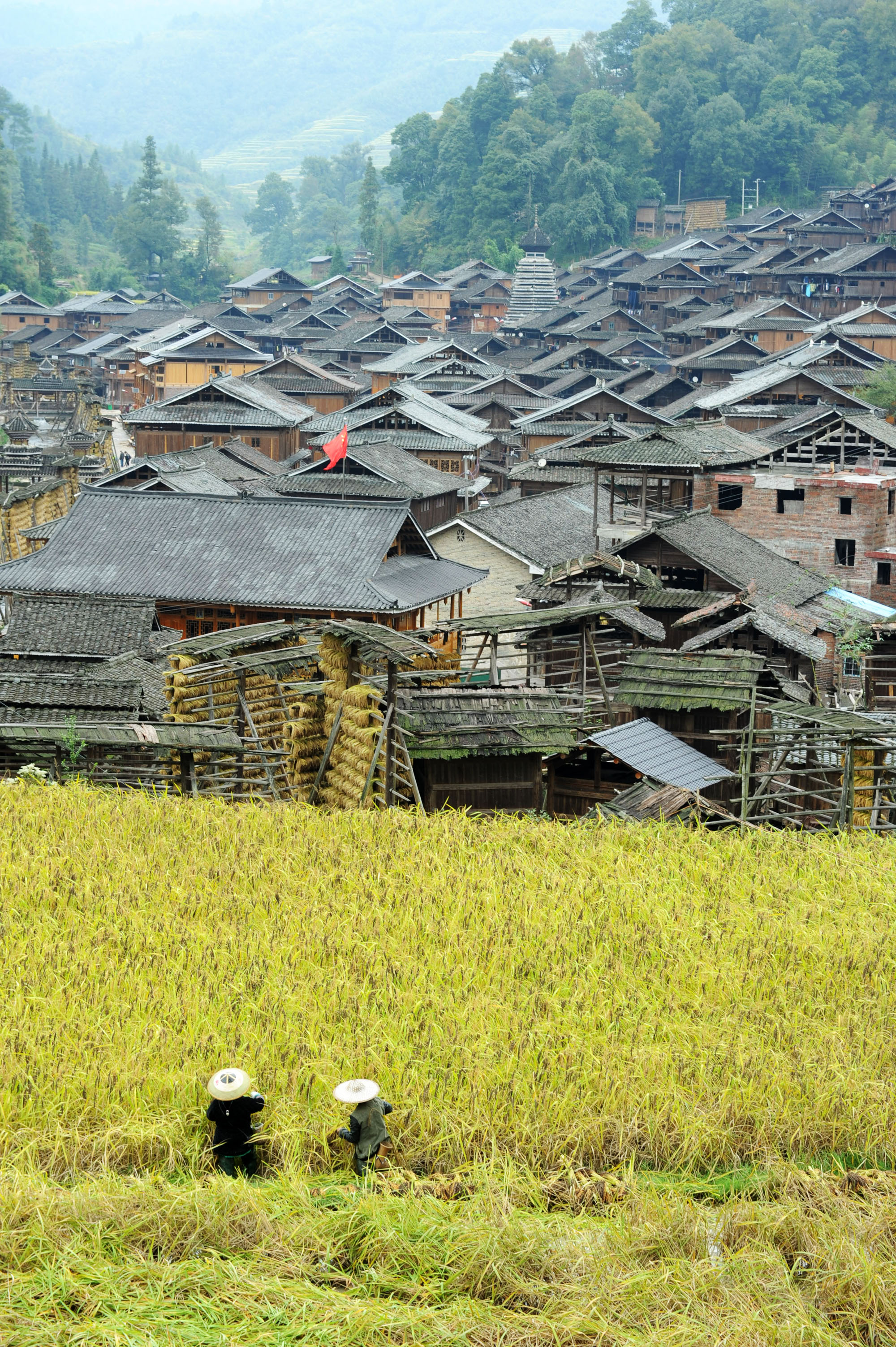 Farmers work in the paddy fields at Zhanli Village of Gaozeng Township in Congjiang County of Qiandongnan Miao and Dong Autonomous Prefecture, southwest China's Guizhou Province. (Xinhua/Yang Wenbin)