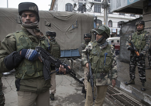 Indian police and paramilitary troopers stand guard after suspected militants hurled a grenade towards their bunker in Srinagar city, the summer capital of Indian-controlled Kashmir, Jan. 18, 2019. (Xinhua/Javed Dar)