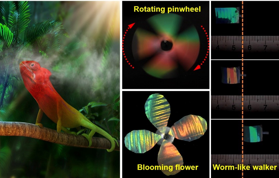 Scientists demonstrate the actuation processes of a rotating pinwheel and a flower with color changes, as well as a worm-like walker that can move forward straight and rhythmically with dynamic color changes.