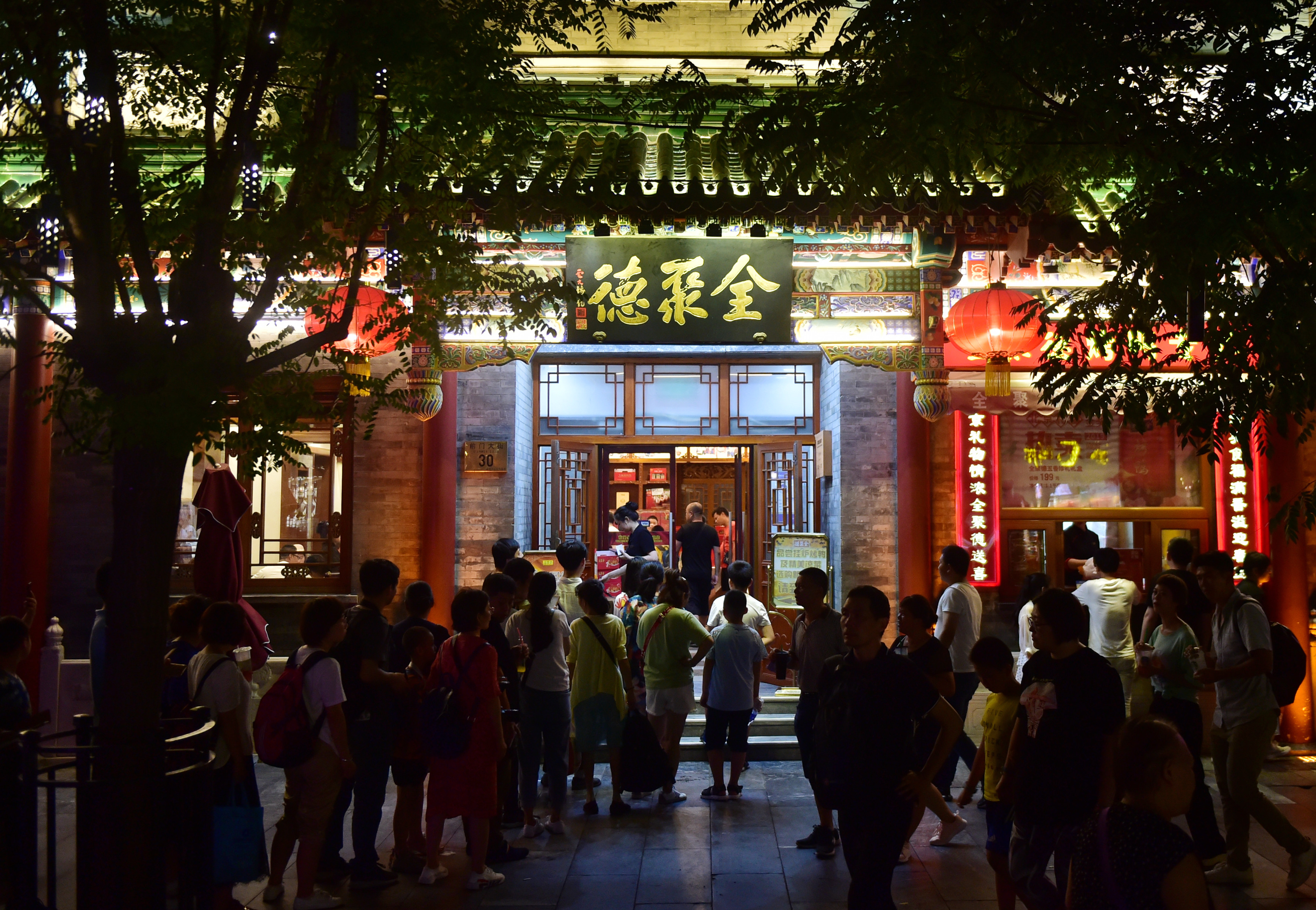 People queue up in front of Quanjude, Beijing's most famous roast duck chain restaurant, at its Qianmen Branch in Beijing, capital of China. (Xinhua/Zhang Chenlin)