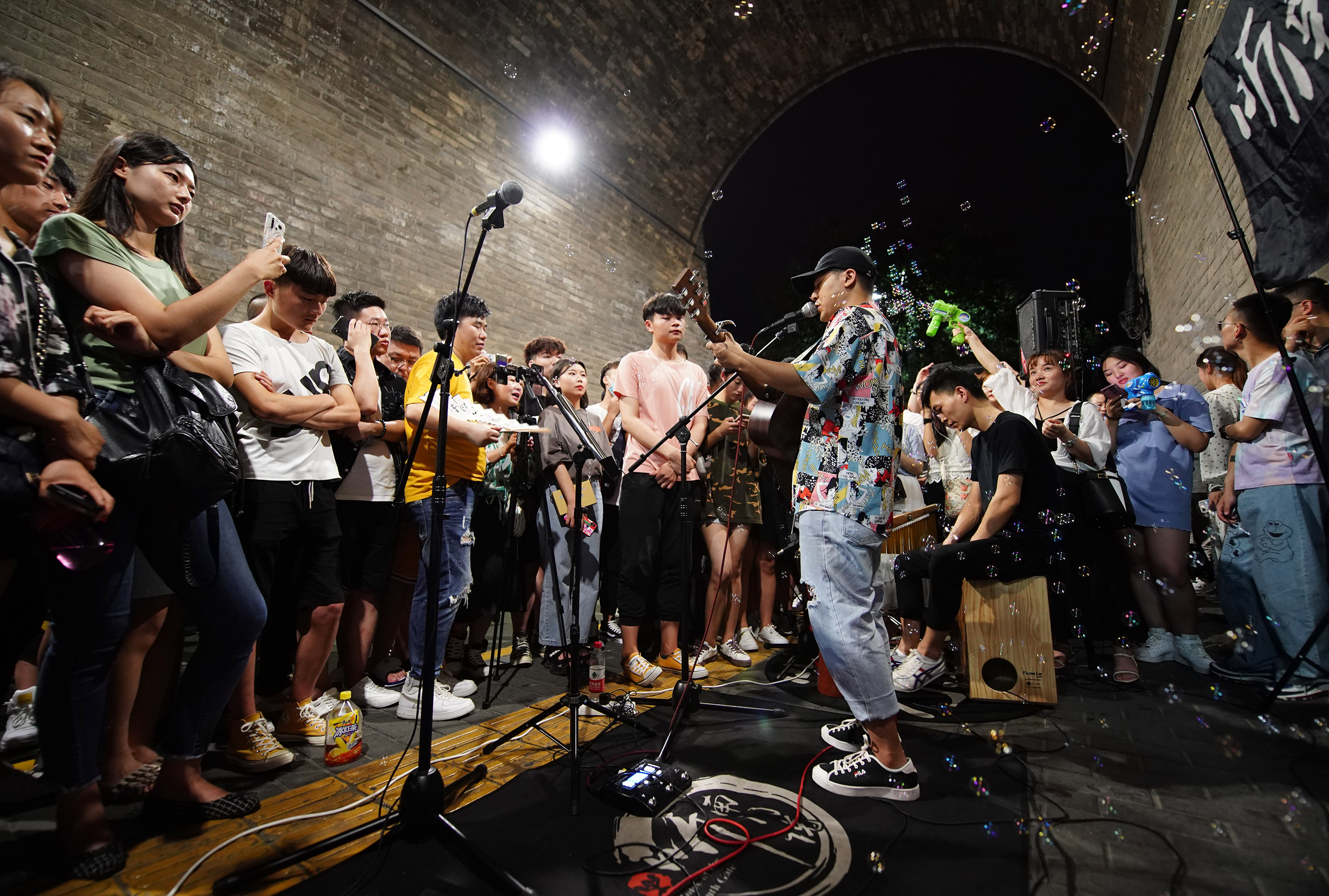 People watch a band performance at the foot of the ancient city wall in Xi'an, capital of northwest China's Shaanxi Province. (Xinhua/Shao Rui)