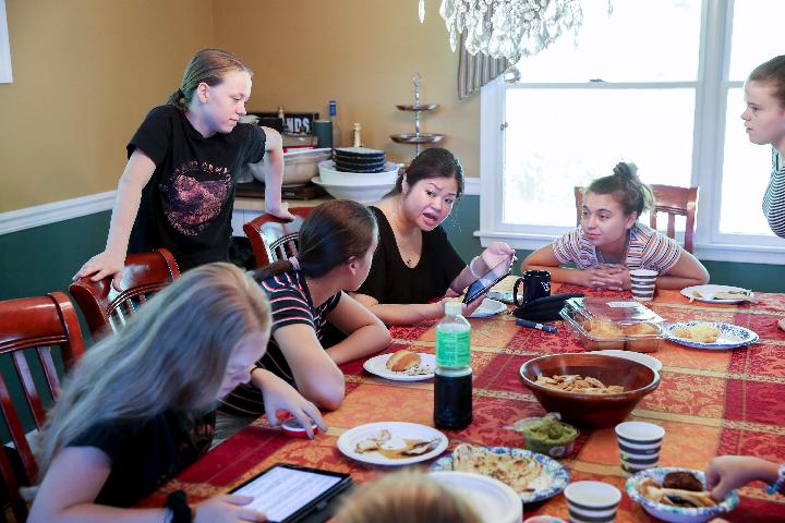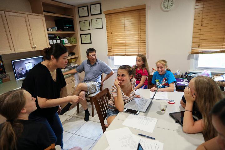 Daughters of Lynn Berat talk with their Chinese teacher Lin (3rd R) at Lin's house in Bernards of New Jersey, the United States, July 13, 2019.