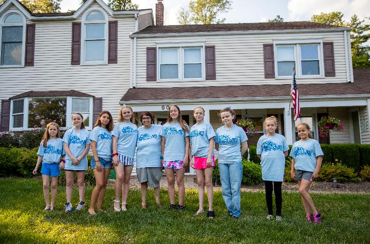 Lynn Berat (5th L) and her nine daughters pose for a photo in front of their Chinese teacher's house in Bernards of New Jersey, the United States, July 27, 2019. (Xinhua/Wang Ying)