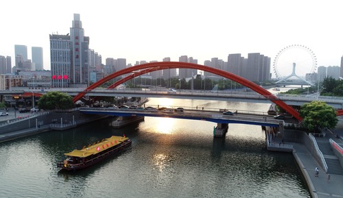Aerial photo taken on June 26, 2019 shows a boat about to sail under the Jin'gang Bridge on the Haihe River in Tianjin, north China. (Xinhua/Yue Yuewei)