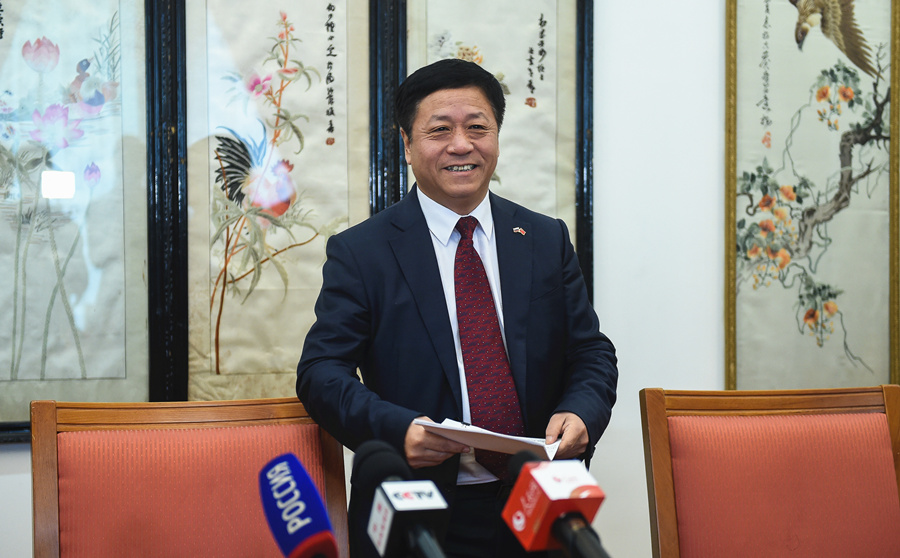 China's new ambassador to Russia Zhang Hanhui addresses reporters at the Chinese embassy in Moscow, Russia, Aug. 14, 2019. (Xinhua/Evgeny Sinitsyn)