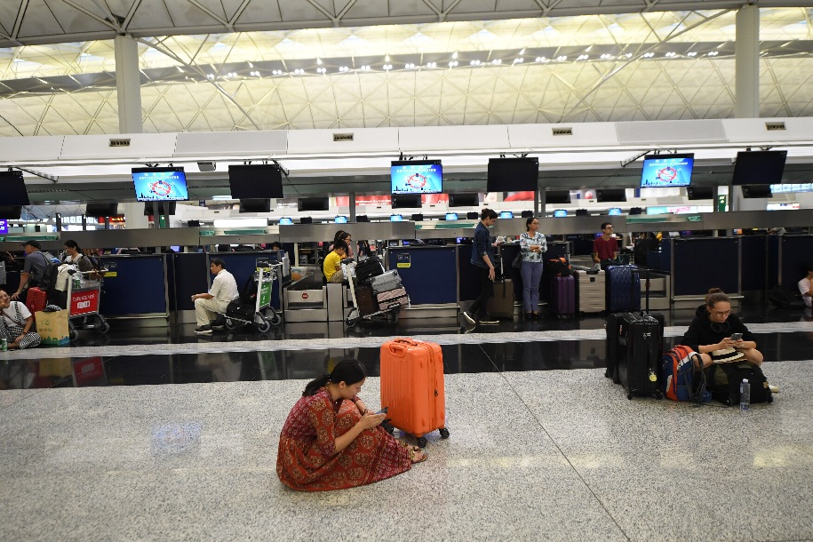Tourists are stranded due to chaos caused by protesters at Hong Kong International Airport in Hong Kong, south China, Aug. 13, 2019. (Xinhua/Lui Siu Wai)