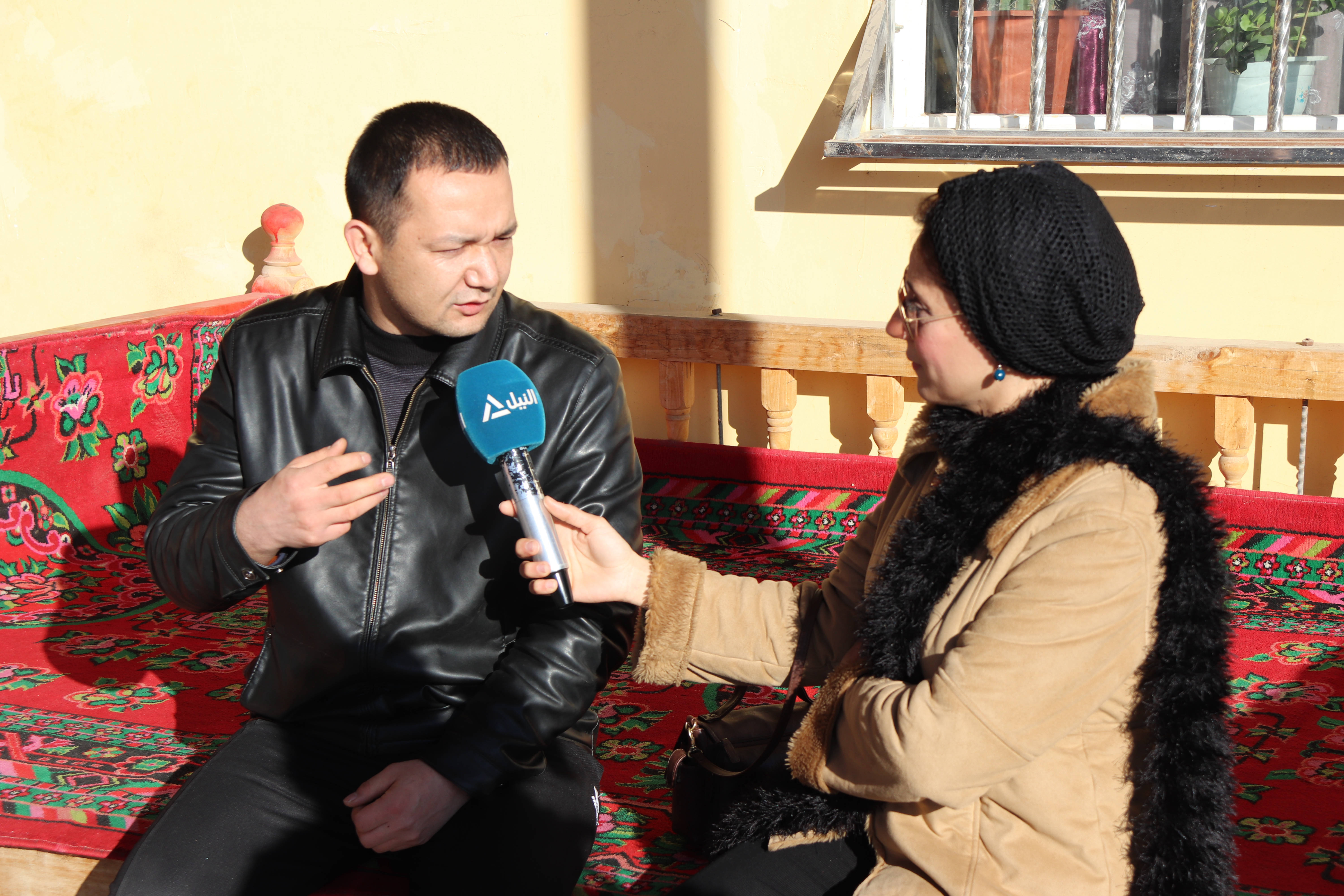A journalist with Nile TV (right) interviews villager Nurmemet Tursun who has just finished his training at a vocational training center in Hotan, northwest Xinjiang Uygur Autonomous Region, Jan. 28, 2019. (Xinhua/Sun Zhe)