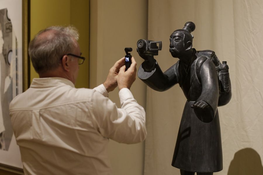 A man takes photos of an exhibit at "Art and Peace: Contemporary Chinese Works" exhibition at Mexico's National Museum of Cultures in Mexico City, capital of Mexico, Aug. 14, 2019. (Xinhua/Francisco Canedo)