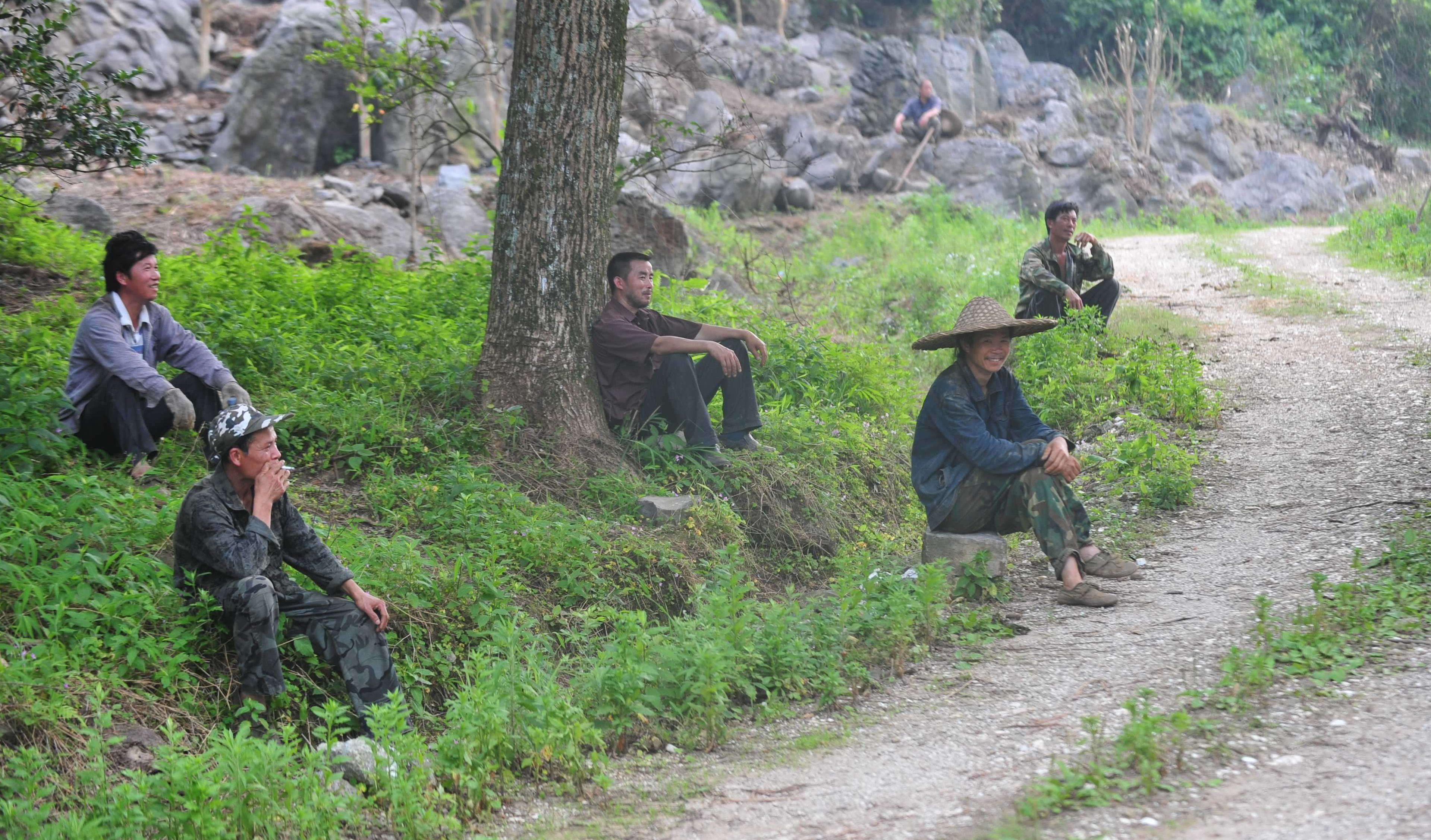 Long Gexiong (2nd R) and villagers take a rest in the mountain at Tongbantun Village of Dongqi Township in Rongan County, south China's Guangxi Zhuang Autonomous Region. (Xinhua/Huang Xiaobang)