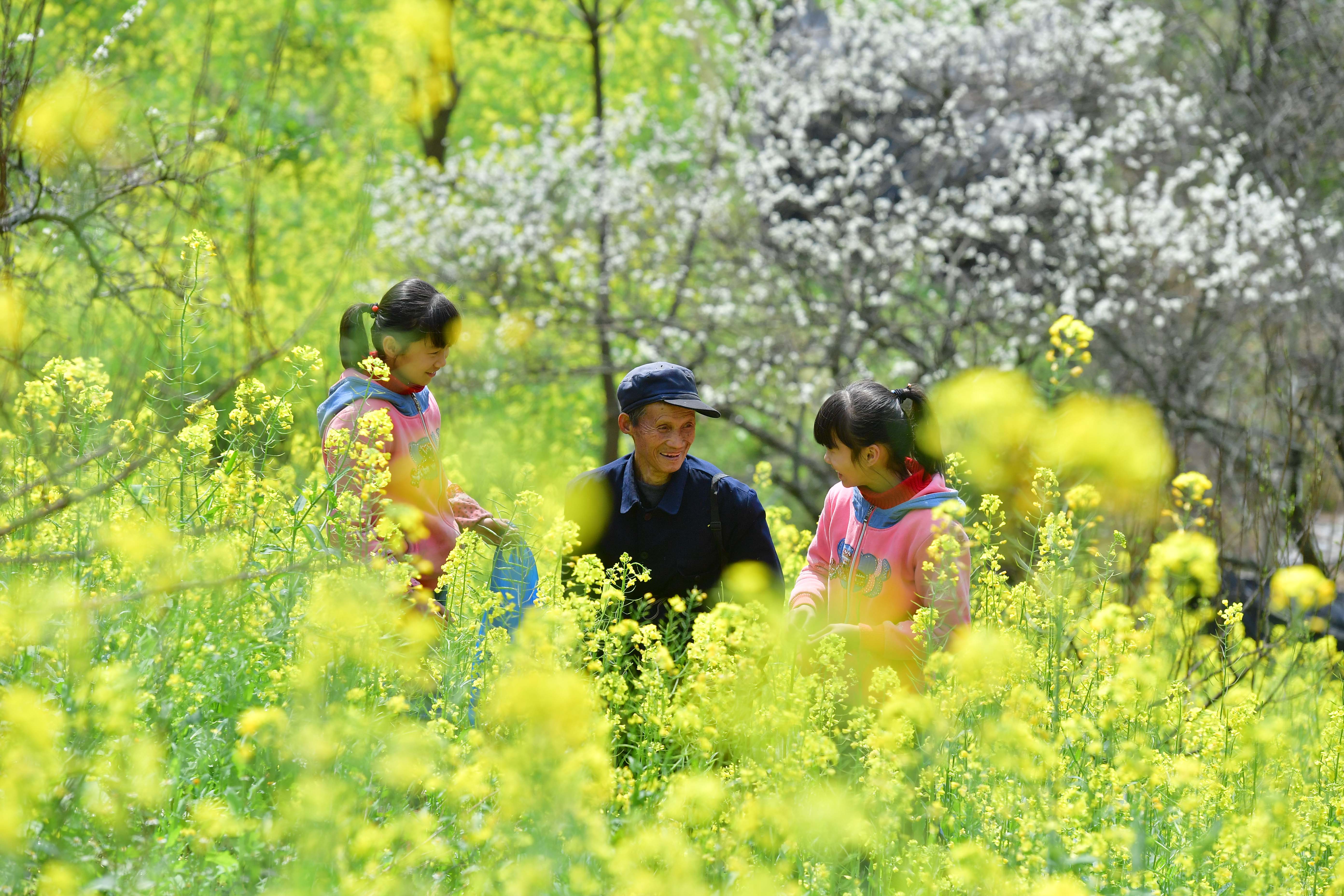 Long Gexiong (2nd L) and tourists view flowers at Tongbantun Village of Dongqi Township in Rongan County, south China's Guangxi Zhuang Autonomous Region. (Xinhua/Huang Xiaobang)