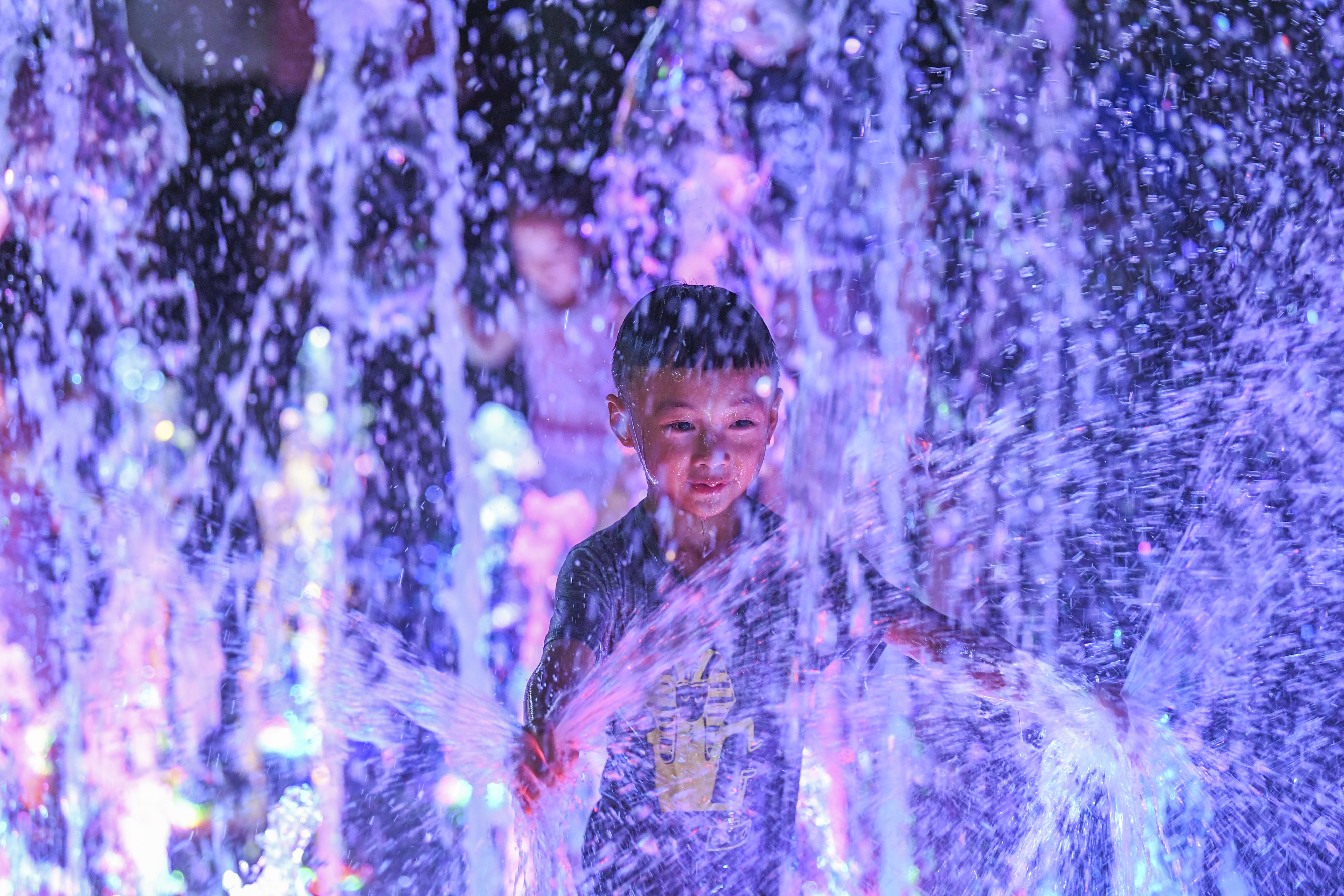 A boy plays with water at a music fountain in Nan'an District of SW China's Chongqing Municipality. (Xinhua/Wang Quanchao)