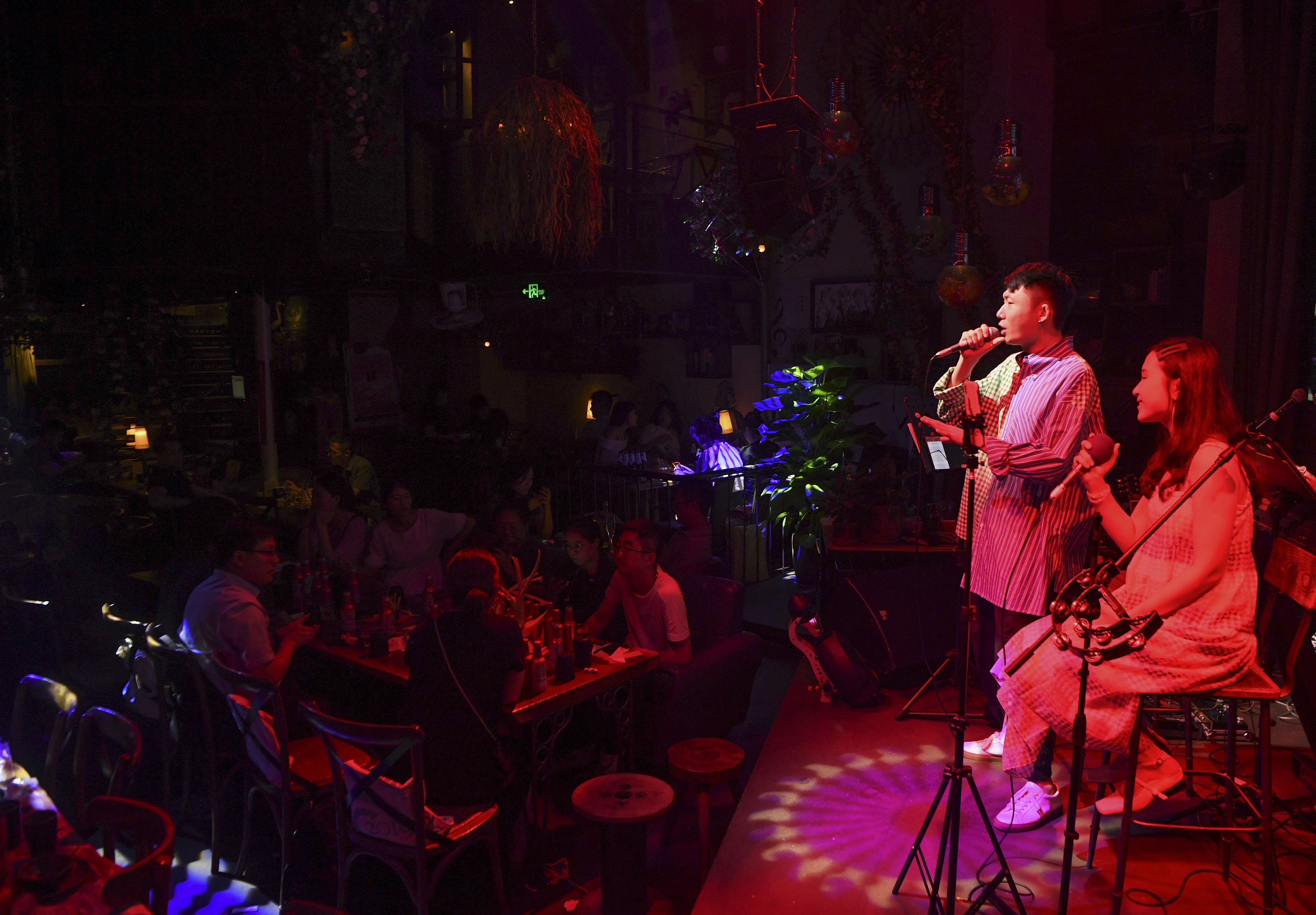 Two singers perform at a night pub in Jiangbei District of SW China's Chongqing Municipality. (Xinhua/Wang Quanchao)