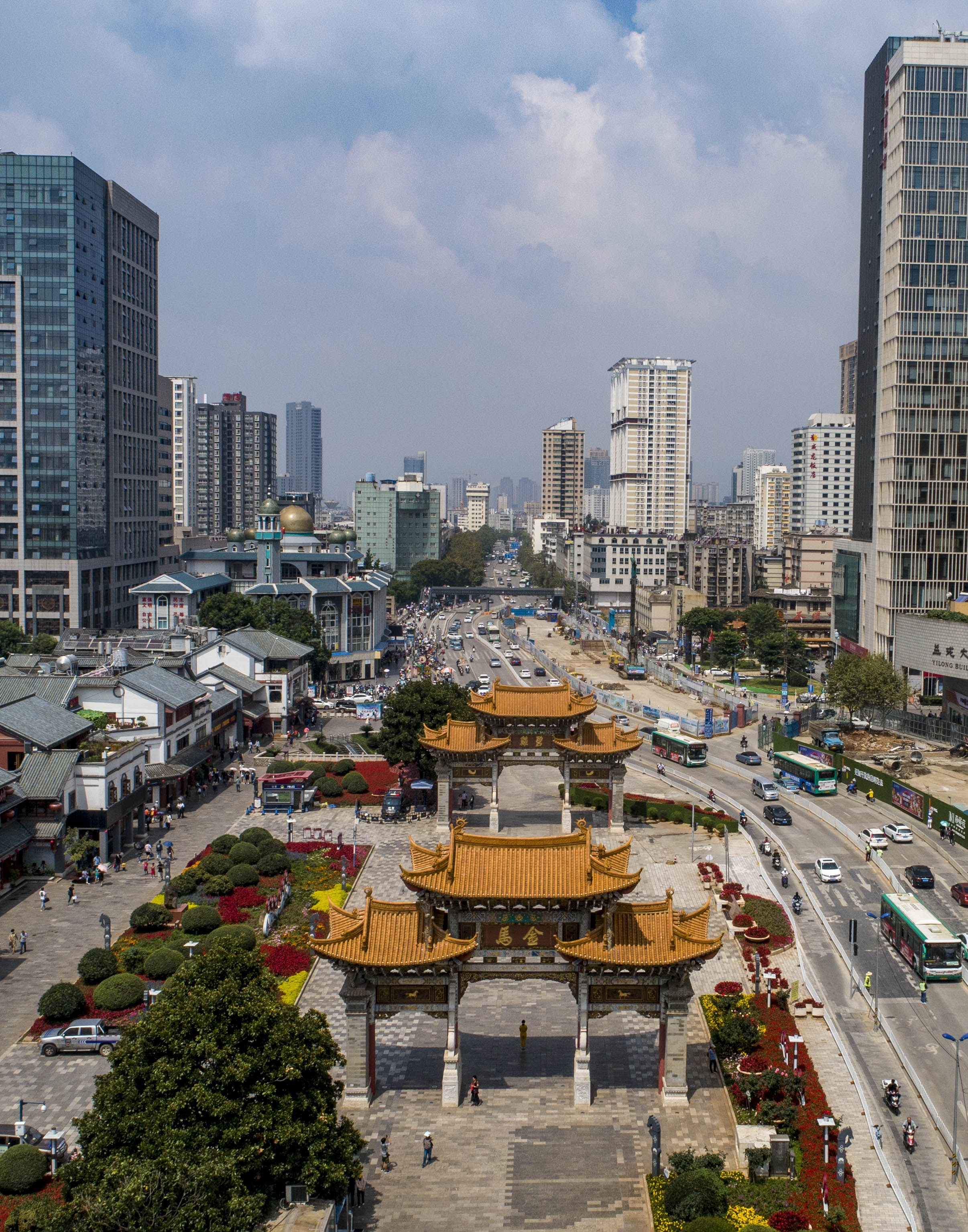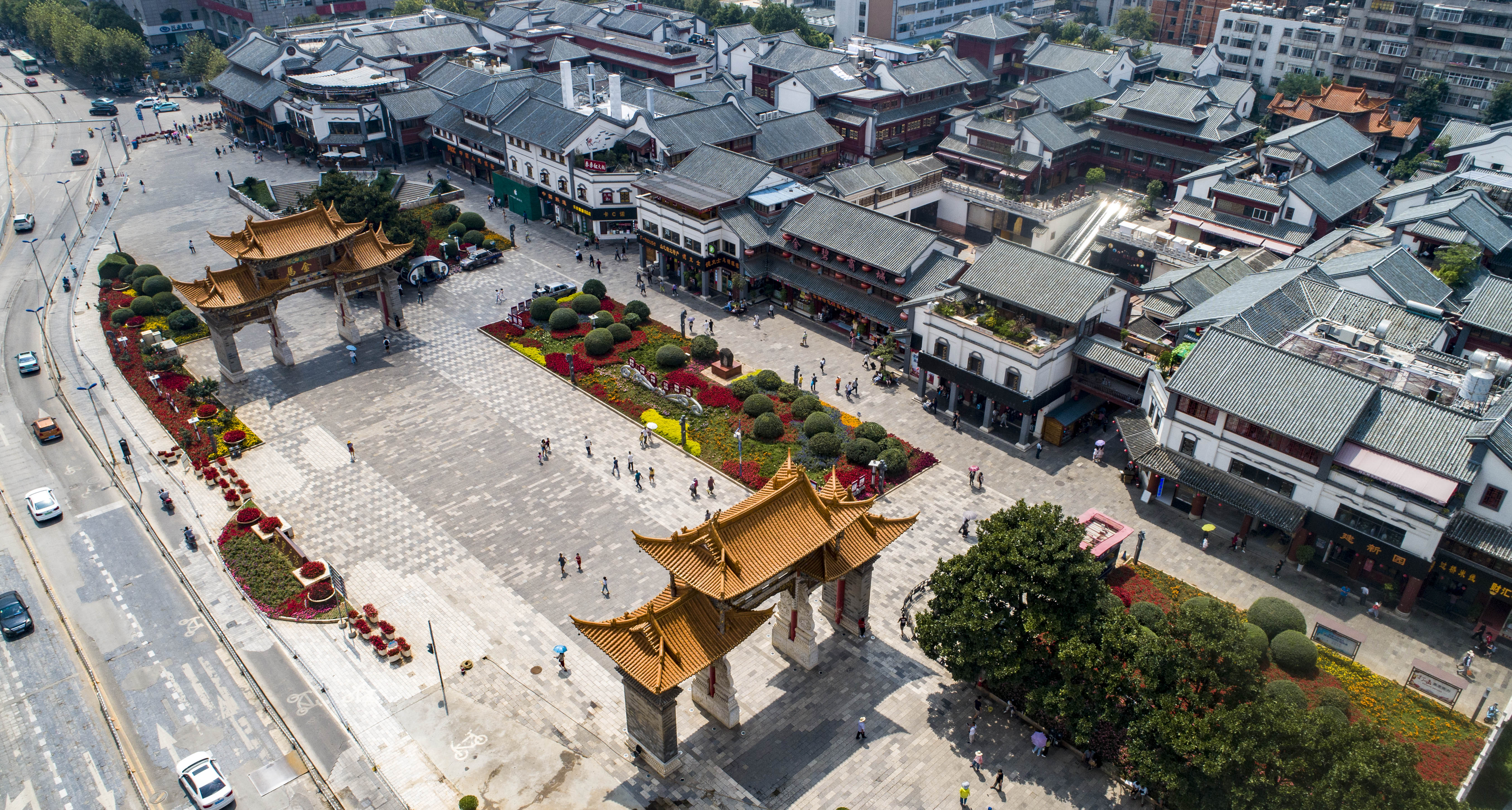 Aerial view of the Golden Horse and Jade Rooster Archways in downtown Kunming, Aug. 16, 2019. (Xinhua/Jiang Wenyao)