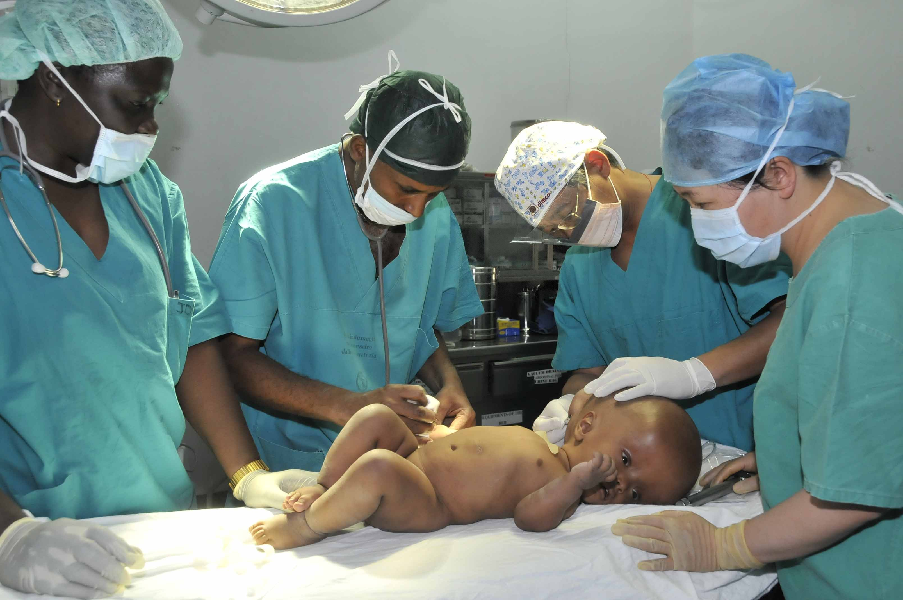 Zhang Xuehui (2nd R) and Deng Qiaorong (1st R), members of a Chinese medical team, prepare an operation for a hydrocephalic child in Asmara, Eritrea, May 23, 2008. (Xinhua file photo)