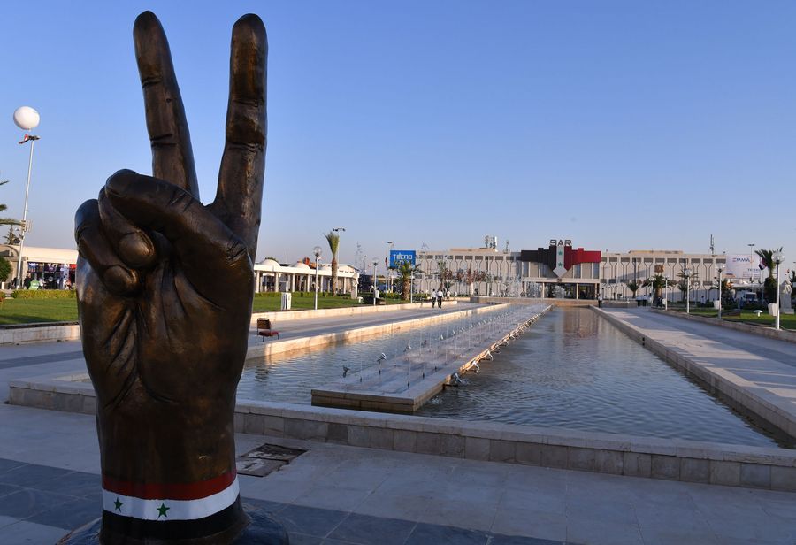 A figurative hand with victory sign is put at the entrance of the Damascus International Fair held in the Fairgrounds of the Syrian capital Damascus on Aug. 28, 2019. (Xinhua/Ammar Safarjalani)