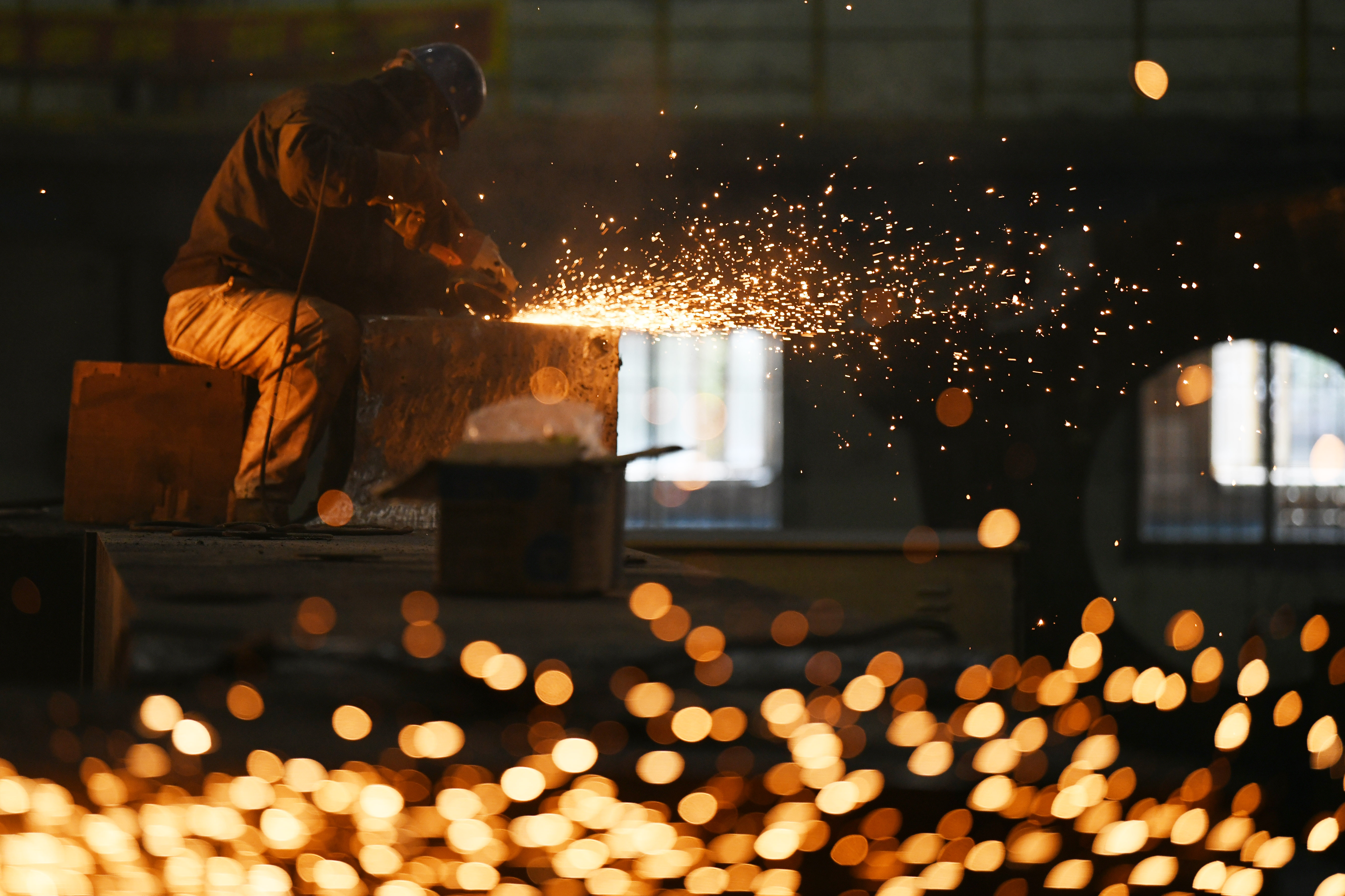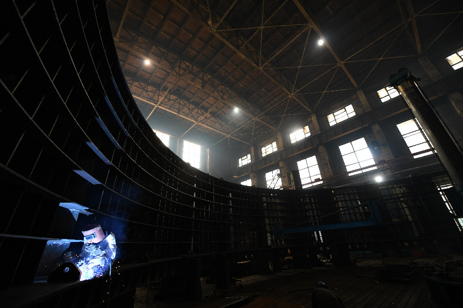 A worker welds components at a factory of Harbin Turbine Company Limited in Harbin, Sept. 3, 2019. (Xinhua/Wang Jianwei)