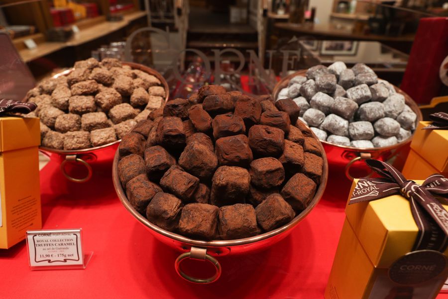 Chocolate candies are seen in a shop in Brussels. Belgium has a great history of making chocolate, which is an important export product of the country. (Xinhua/Zheng Huansong)