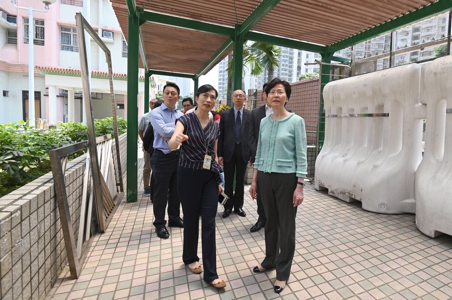 HKSAR Chief Executive Carrie Lam visits a transitional housing project of the Lok Sin Tong Benevolent Society Kowloon in Hong Kong, south China, Aug. 9, 2019. (Xinhua)