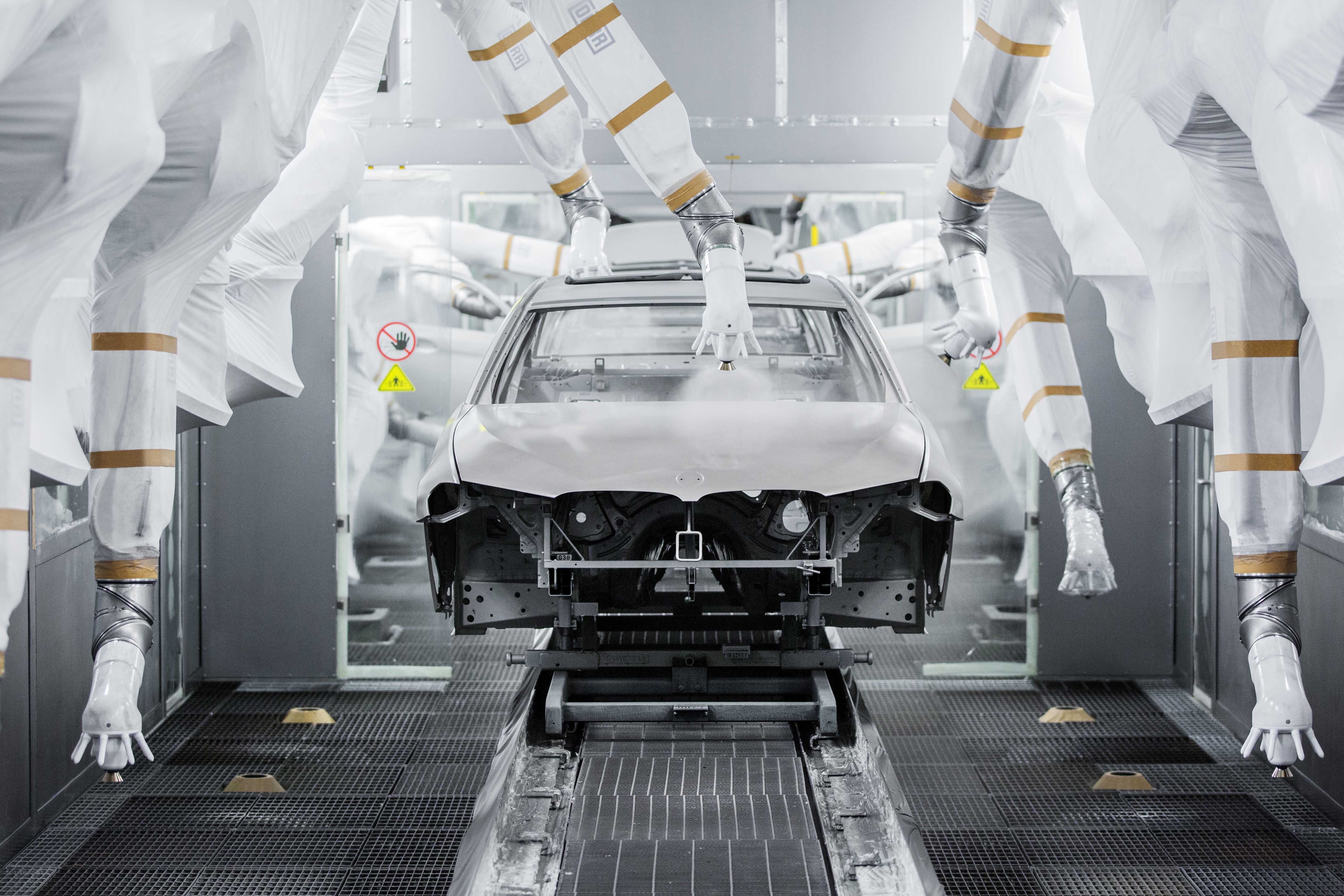 Industrial robotic arms paint a car at Dadong Plant of BMW Brilliance Automotive in Shenyang, capital of northeast China's Liaoning Province. (Xinhua)