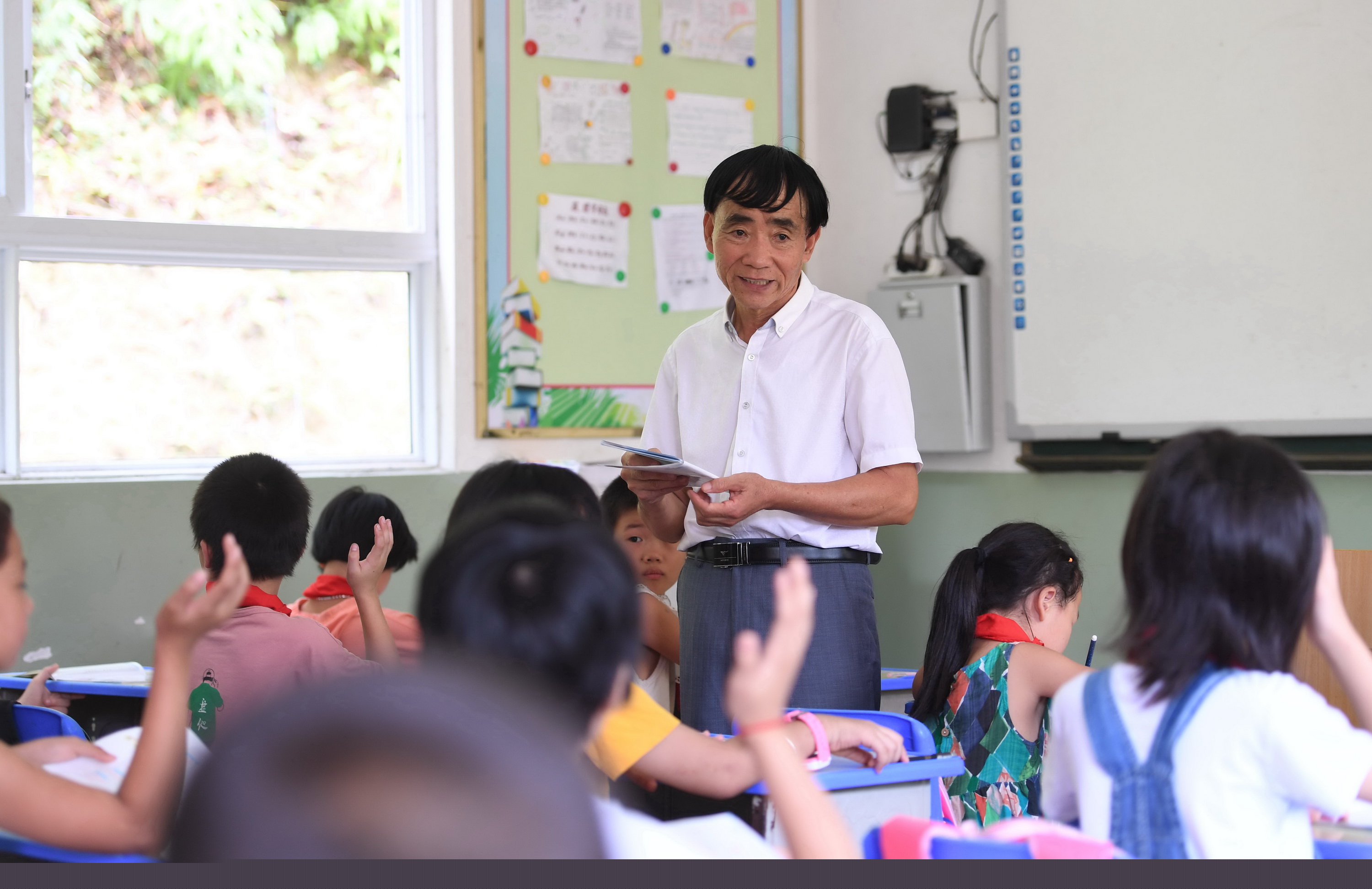 Zhuang Guigan gives a lesson to students at the Xijin She ethnic group primary school, Sept. 4, 2019. (Xinhua/Lin Shanchuan)