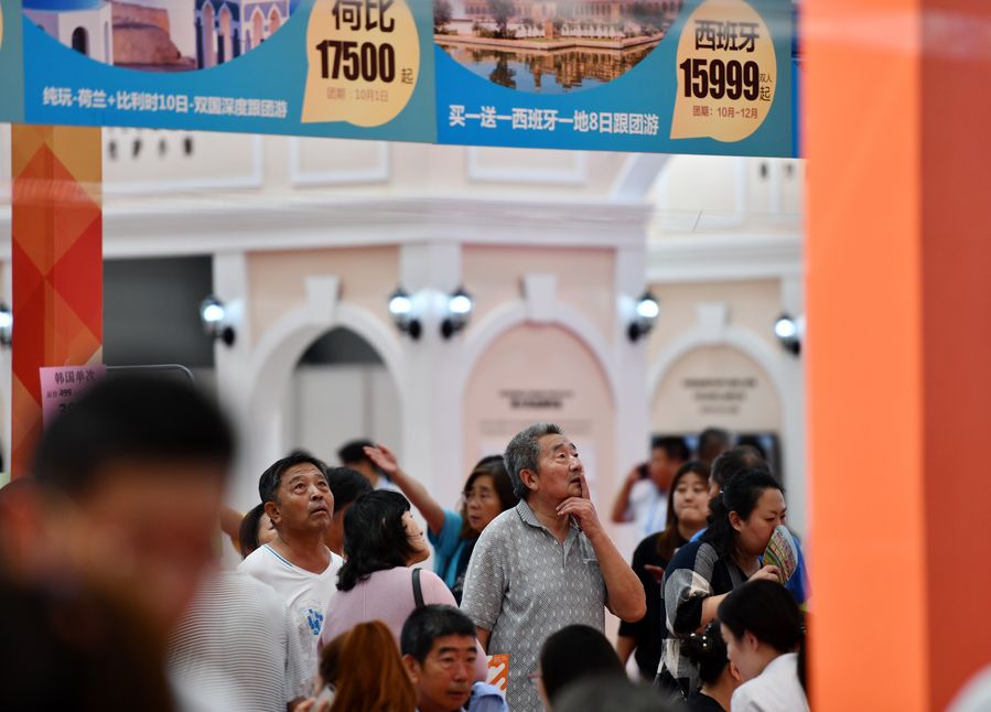 People read advertisements about tourism services at the China Tourism Industry Exposition (CTIE) in north China's Tianjin Municipality, Sept. 6, 2019. (Xinhua/Li Ran)