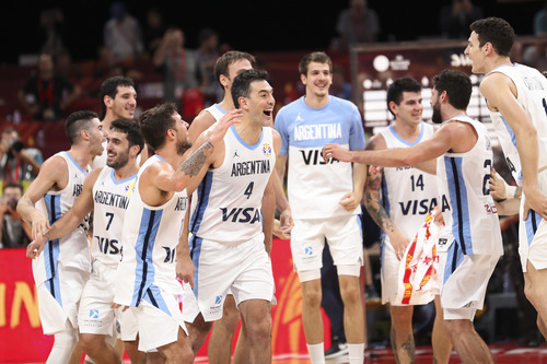 Players of Argentina celebrate after the semifinal match between Argentina and France at the 2019 FIBA World Cup in Beijing, capital of China, Sept. 13, 2019. (Xinhua/Meng Yongmin)