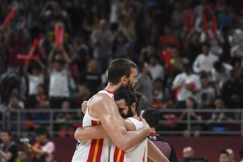 Marc Gasol (L) of Spain hugs teammate Ricky Rubio after the semifinal match between Spain and Australia at the 2019 FIBA World Cup in Beijing, capital of China, Sept. 13, 2019. (Xinhua/Zhang Chenlin)