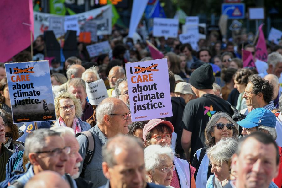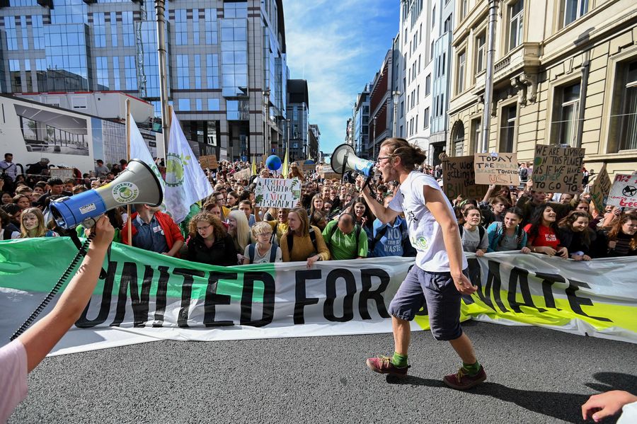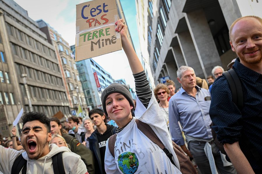 People participate in a march calling for action against climate change in Brussels, Belgium, Sept. 20, 2019. (Photo by Riccardo Pareggiani/Xinhua)