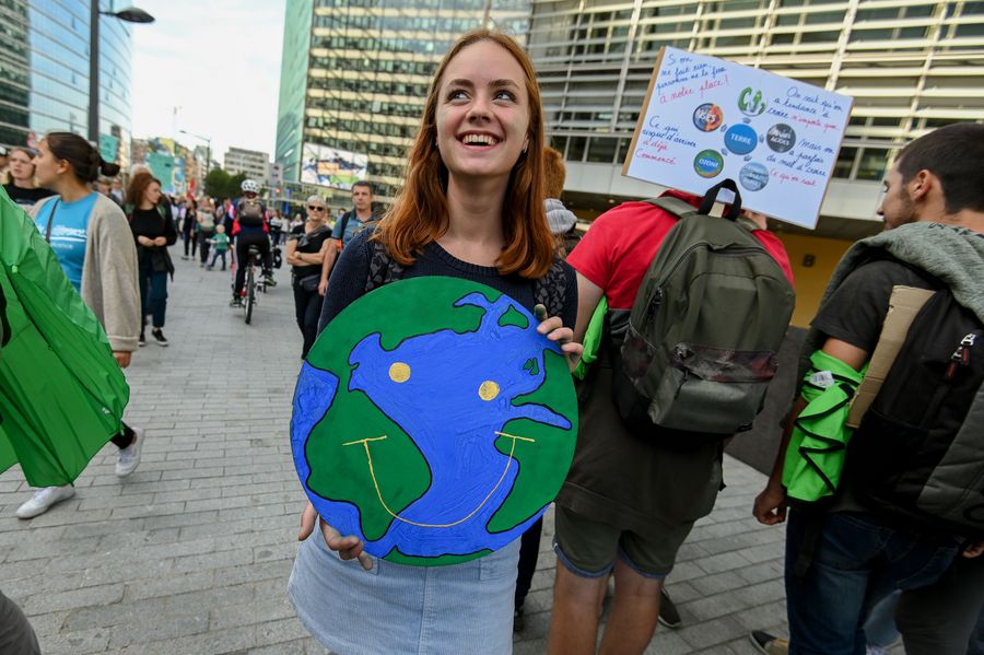 A man holds a placard during a march calling for action against climate change in Brussels, Belgium, Sept. 20, 2019. (Xinhua/Zheng Huansong)