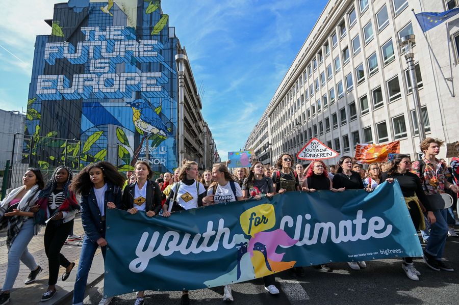 Young people participate in a march calling for action against climate change in Brussels, Belgium, Sept. 20, 2019. (Photo by Riccardo Pareggiani/Xinhua)